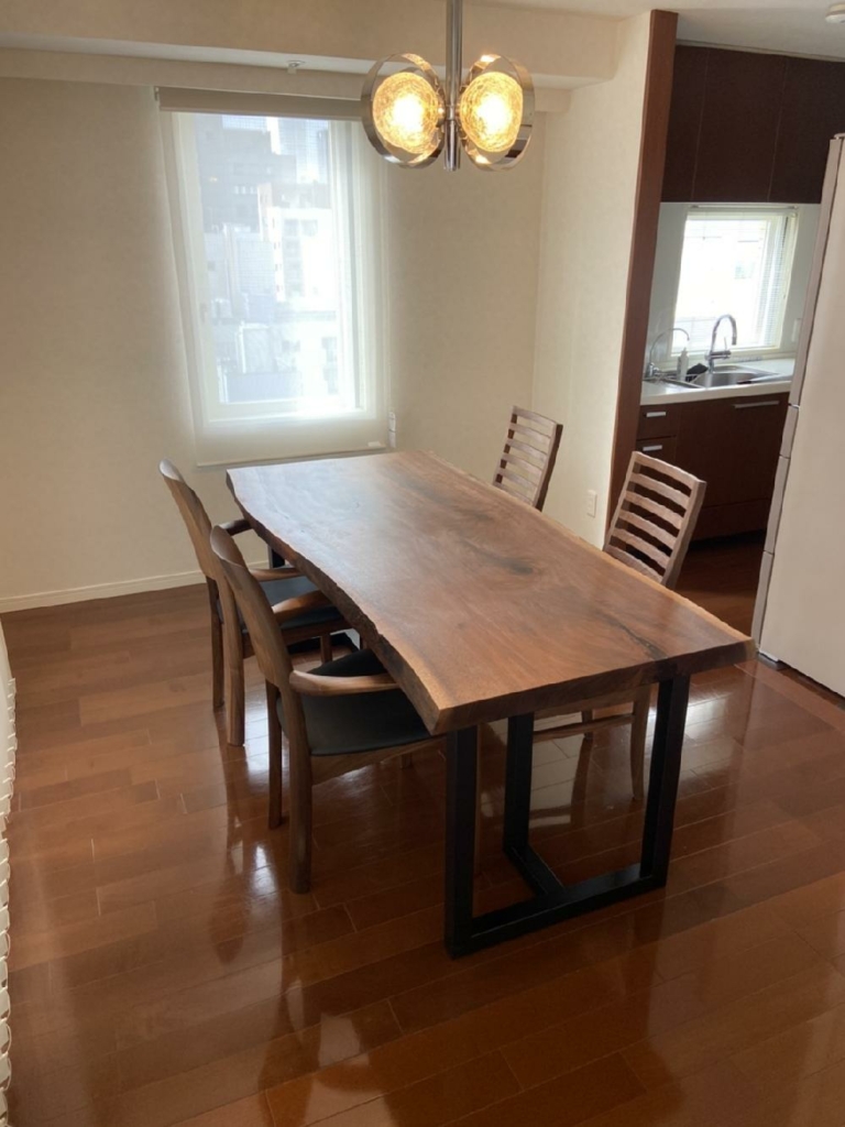 大阪市天王寺区にアメリカンウォールナット一枚板のダイニングテーブルとTVボード、