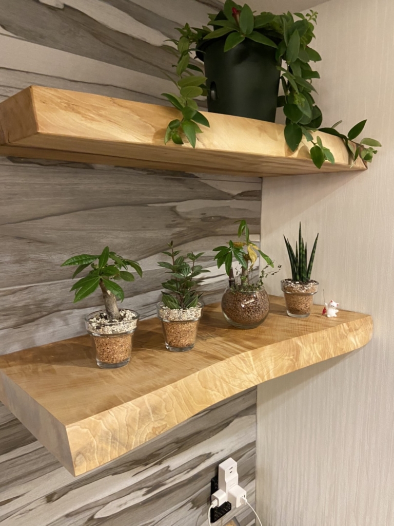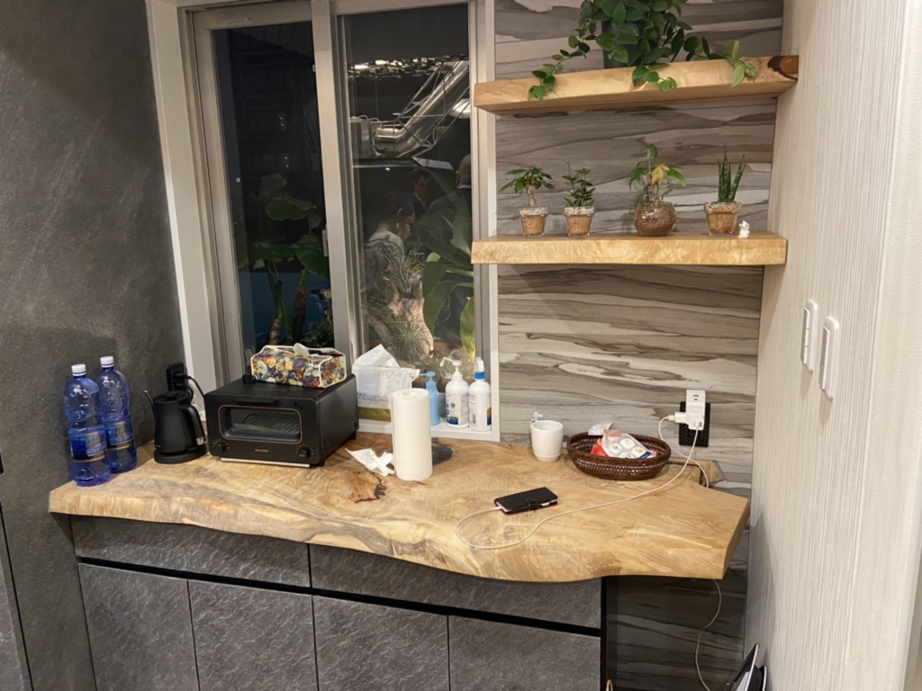 kan-nakayaからはケヤキ一枚板と別注アイアン脚のローテーブル、栃一枚板をカットしてカウンター天板と棚を造らせていただきました^ ^