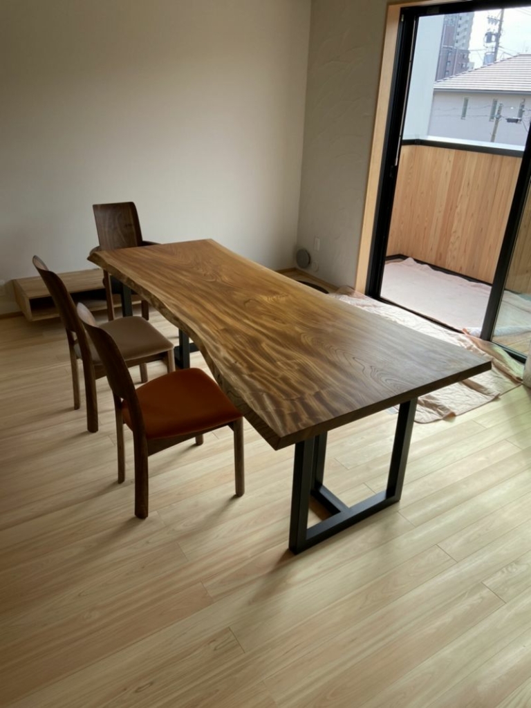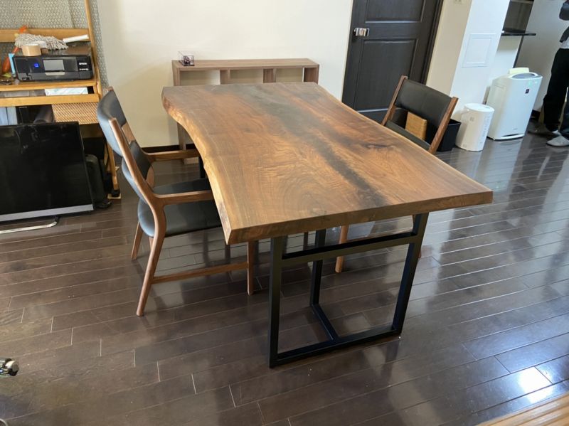 一枚板ダイニングテーブル用とアイアン脚、ダイニングチェアもウォールナットで2種類x2台ずつ揃えてお届けしました^ ^