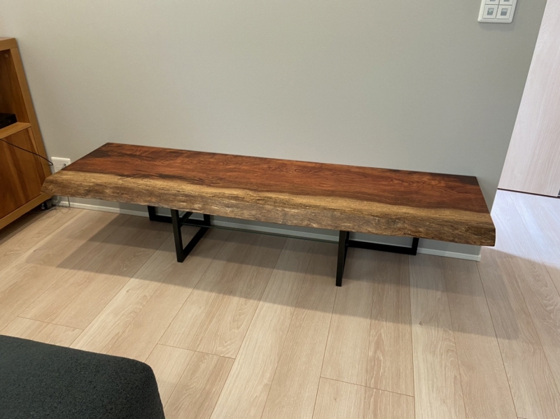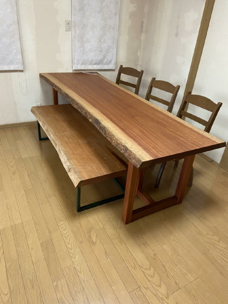 堺市に栃一枚板ダイニングテーブル(50角アイアン脚梨地塗装)とベンチ、