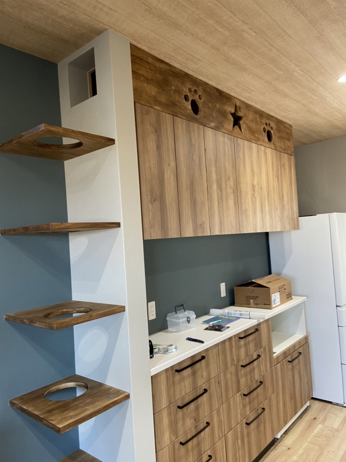猫が6匹いるのでキャットタワーを作られ、バックキャビネットの上の穴から顔を出せるようにされてました