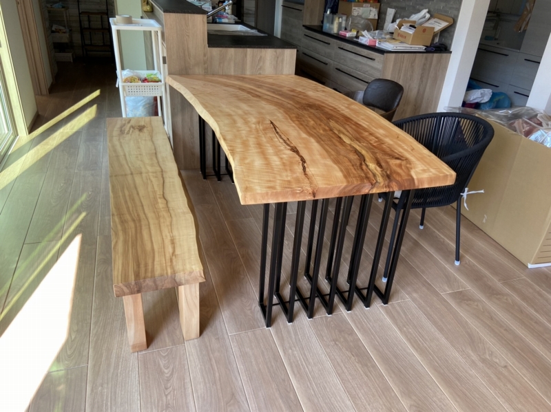 高石市のお客様宅へ奥行の広いケヤキの一枚板のダイニングテーブルとベンチ