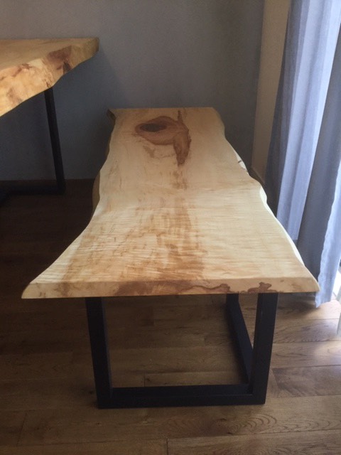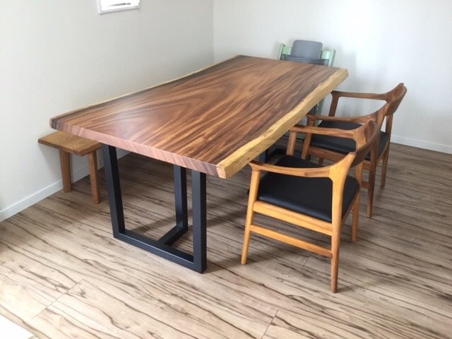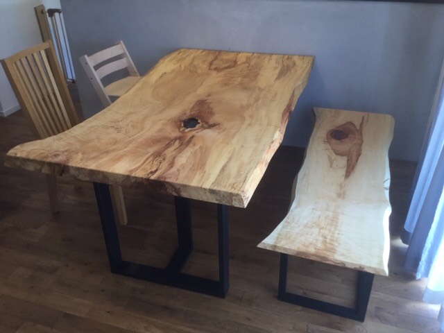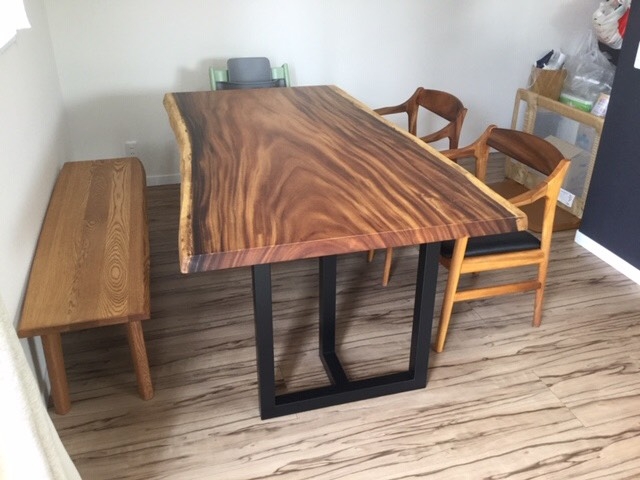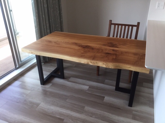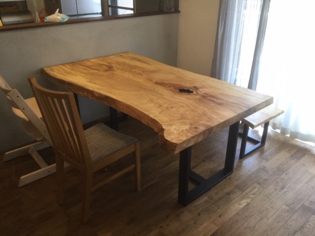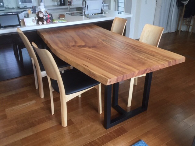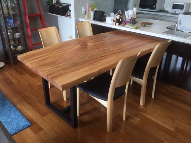 栃の一枚板、メープルの座りやすいダイニングチェア、梨地塗装のアイアン脚