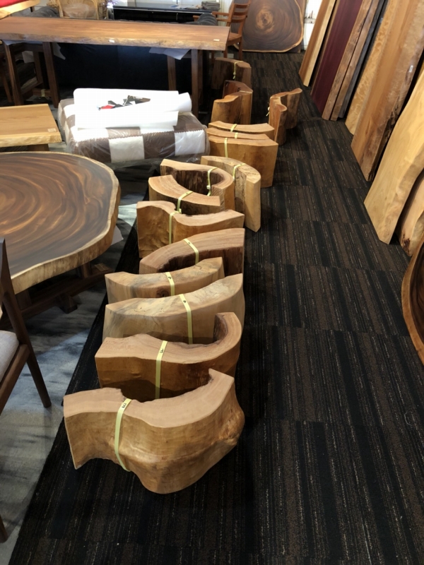 29日に新しい一枚板が12枚、輪切りの脚が6セット入荷しました。