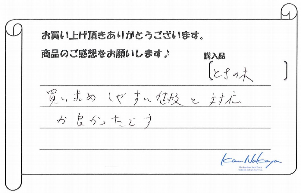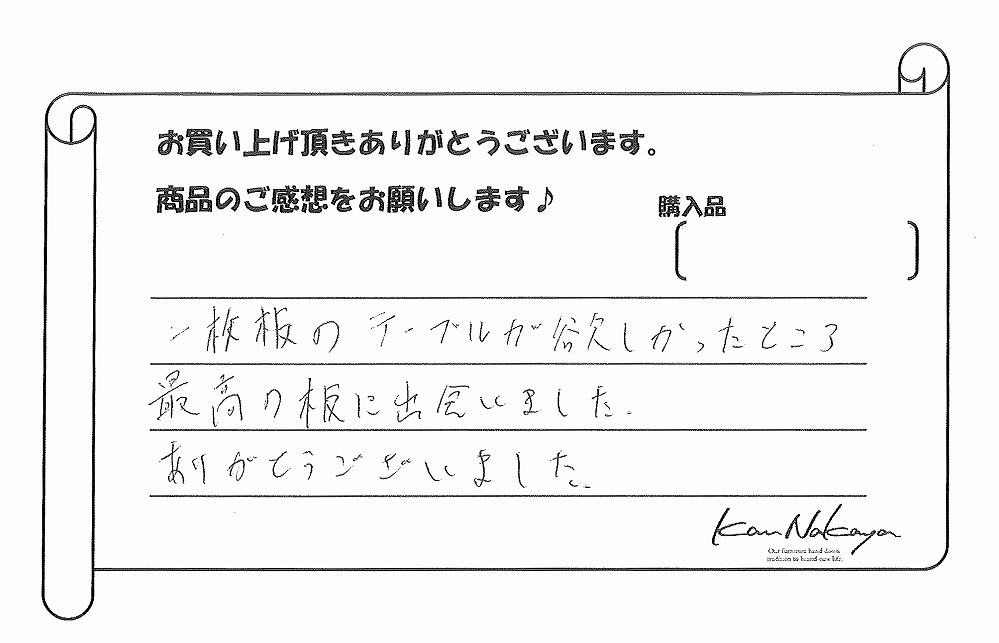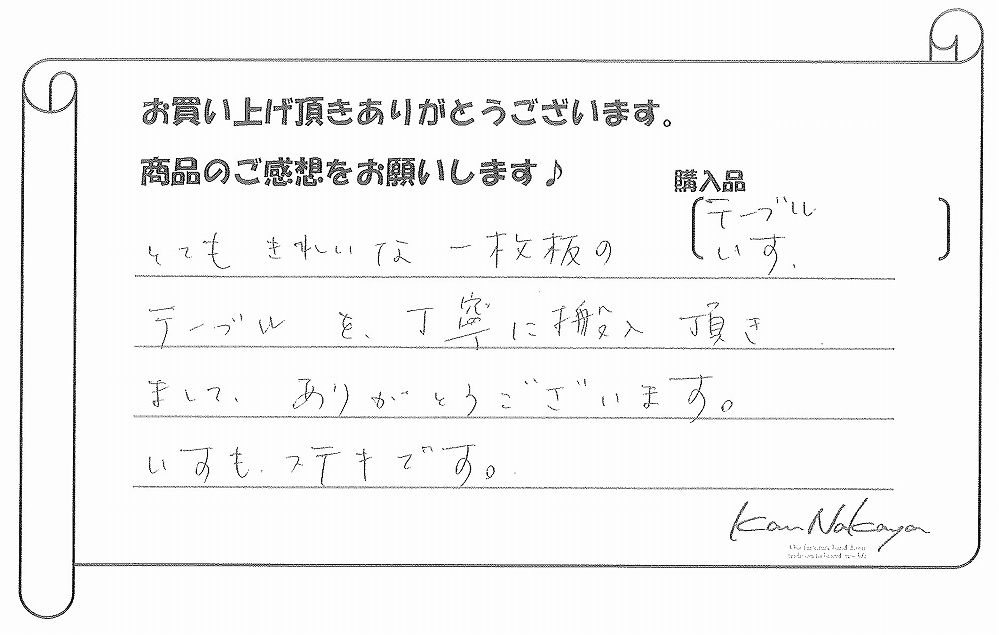 『とてもきれいな一枚板のテーブルを、丁寧に搬入頂きまして、ありがとうございます。