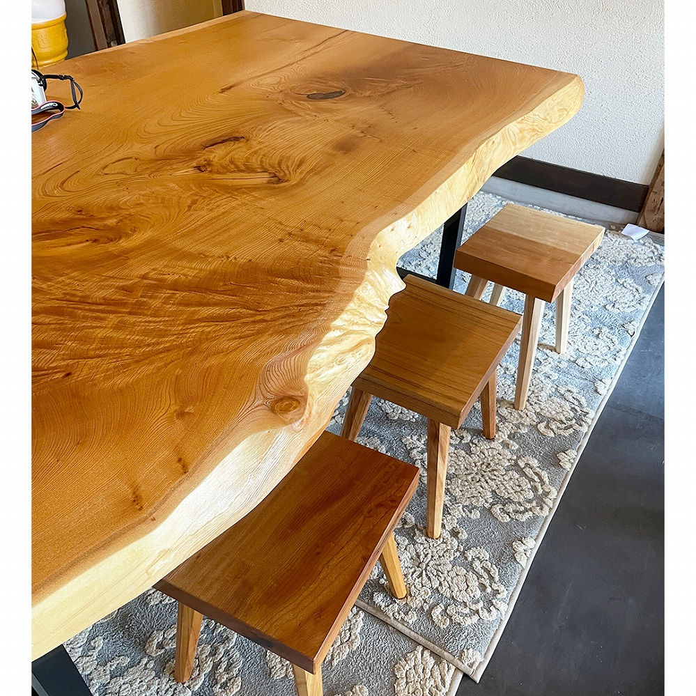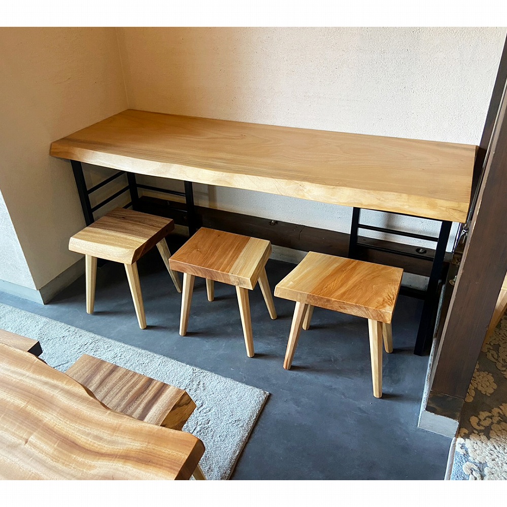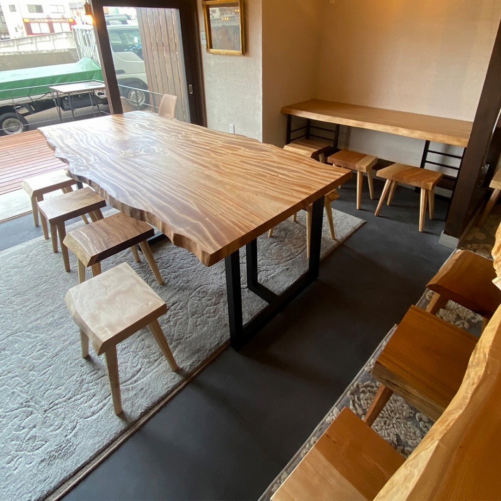 店内が一枚板で溢れています!椅子も全て一枚板を使用したスツールです♪