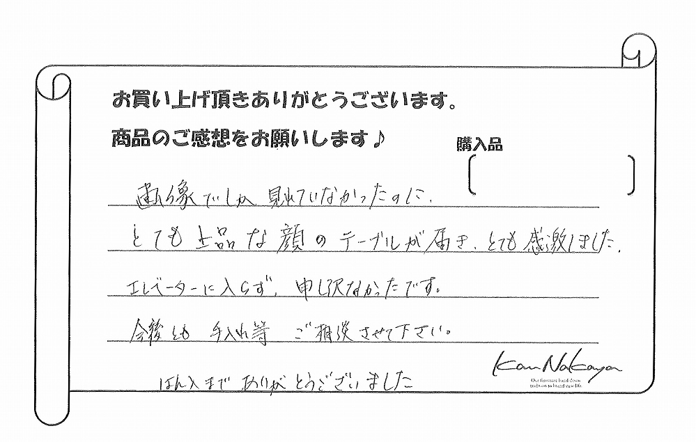 『画像でしかみれていなかったにとても上品な顔のテーブルが届き、とても感激しました。エレベーターに入らず、申し訳なかったです。