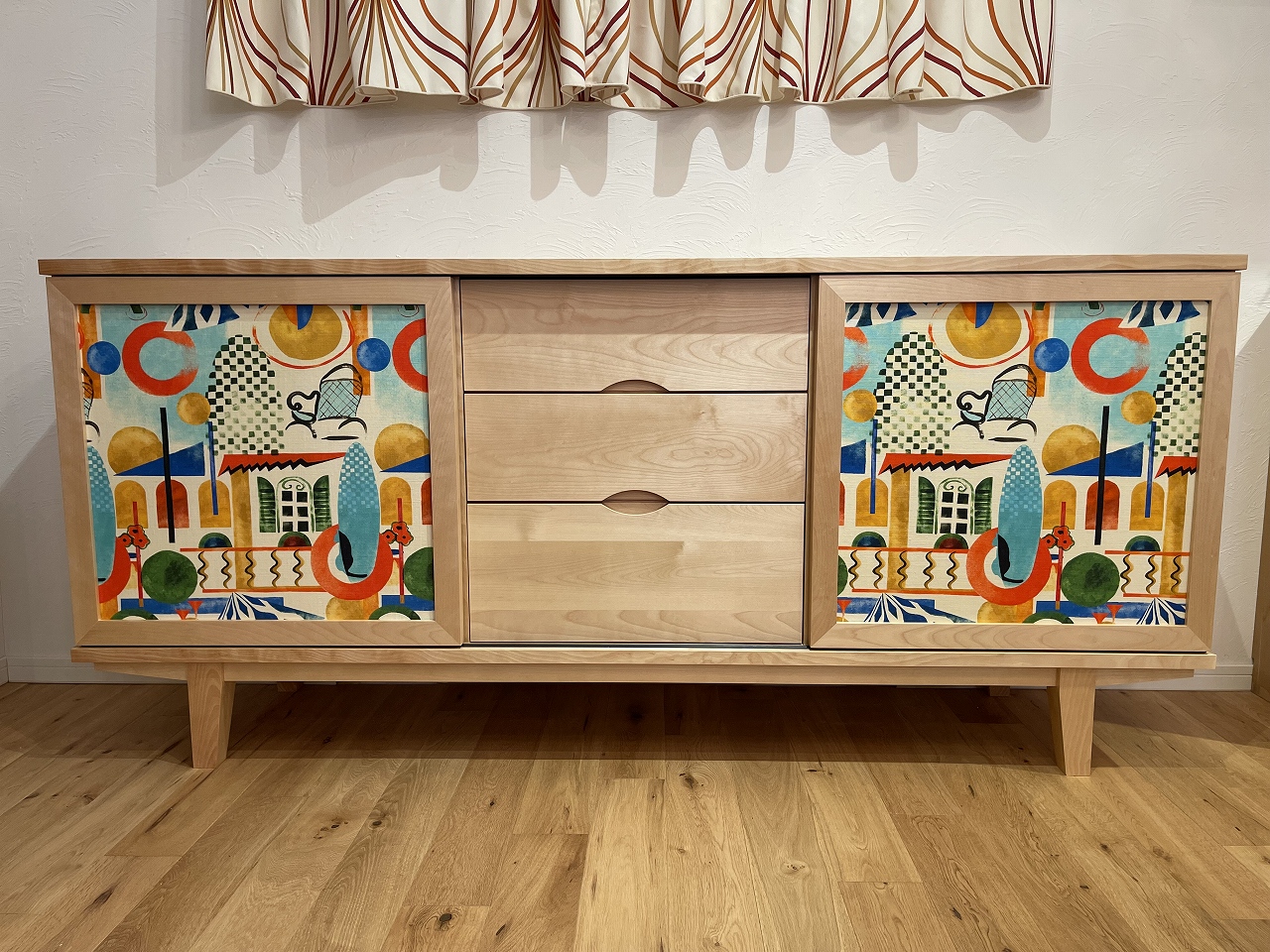 天然素材を用いた家具を得意とするKan Nakayaオリジナルのサイドボードは、布製クロスとのコラボがスマートな逸品。お客様にお好みのクロスを選んで頂きお客様だけのオリジナル家具としてお届け致します。