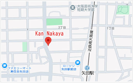 Kan Nakaya(カン ナカヤ)は大阪府大阪市東住吉区にあり、陸上競技場やJリーグの試合などでご存知の方も多い長居公園の近くです。