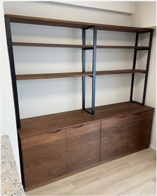 今まで見たことのないサイドボードを、お部屋ピッタリにウォールナット材とアイアンでお作りさせて頂きました。下は収納たっぷりで隠せる収納を、オープン棚は飾り棚としても使える見せる収納を。パソコンも置いて作業も出ます。引き出しの中はA4ファイルや本も入る高さをご指定して頂き見事完成!ウォールナットとアイアンの組み合わせが格好良くて素敵ですね!