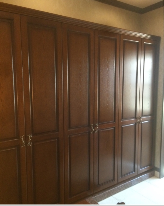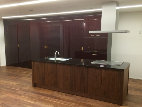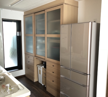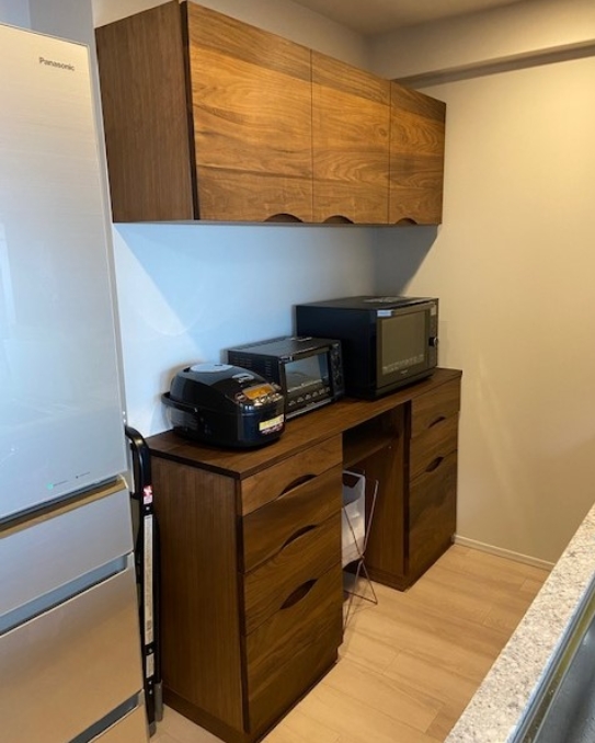 キッチンのバックキャビネットを使いやすい様にオーダーでお作りさせて頂きました。ウォールナットの高級感だけでなく、施工の際も上置きの高さの位置もご指定で使い勝手抜群!の自慢のバックキャビネットですね。