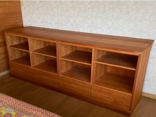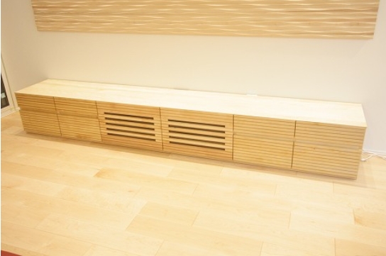 フローリングに合わせてカバ桜で、幅3mのテレビボードをお造りさせて頂きました。大型テレビはもちろん、スピーカーなども並べて置くこともでき、一か所にまとまるのでお部屋がスッキリします。又収納抜群で中が見えないですが、さりげなくガラス入りなのでリモコン操作も大丈夫です。凄いの一言ですね!