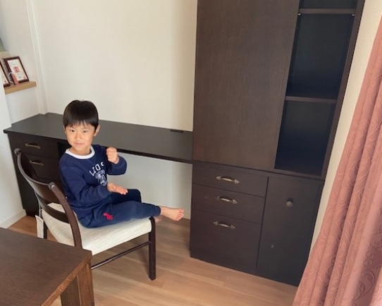 馴染みのお客様よりお子様の入学の為デスクと本棚収納をオーダーでご注文頂きました。壁ピッタリで使いやすさもいいですね!このデスクでの勉強楽しみですね。大人にになっても使えるシックなデザインも素敵です。