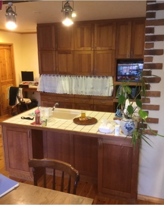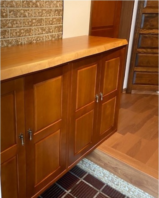 お届けは10年以上も前になりますキッチン・とバックキャビネットです。ご新築の際にブラックチェリー材でフルオーダーでお作りさせて頂きました。今回は扉の蝶番の交換でお邪魔させて頂きましたが、とても綺麗に使って頂いており、又無垢材のオイル仕上げだけあって10年たってもきれいで風合いが出てますね!天然木は年数が経つ事により、より魅力が感じられます。色濃くなったチェリー材は格別でした!素敵な空間です。
