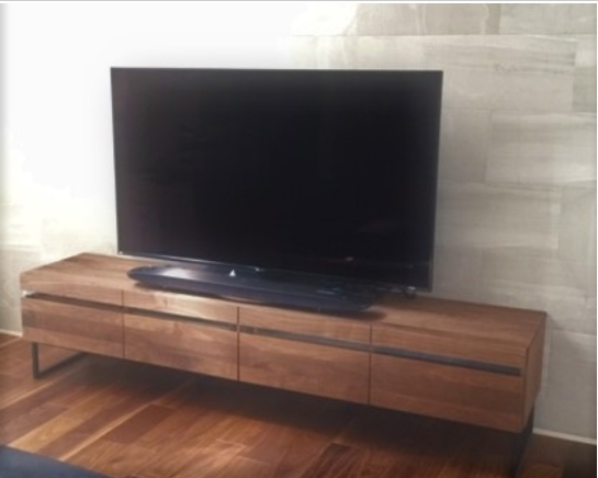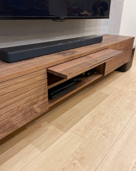 2400幅のウォールナット材TVボードをオーダーでお造りさせて頂きました。脚はアイアイン細身のスッキリとしたデザインで格好良く。たくさんある機器類も外から見えないようにしました。高級感が漂いますね。
