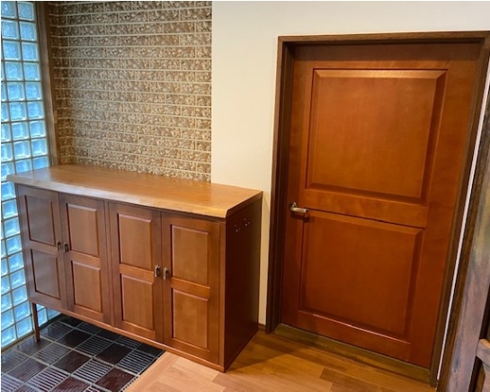 お部屋の雰囲気に合わせて下駄箱と扉をオーダーでお作りさせて頂きました。下駄箱の天板には山桜の一枚板を使用し、取っ手も真鍮取っ手を選ぶなど、こだわりの下駄箱です。右隣にあるお部屋の扉もお作りさせていただきました。別注でしかない雰囲気の良さが漂っています!