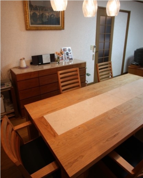 無垢オイル仕上げのブラックチェリー材の集成材でお造りさせて頂きましたダイニングテーブルです。更にダイニングテーブルに天然大理石を入れさせて頂き、奥に写っている天然大理石のチェストもお造りさせて頂きました。