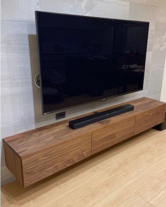 壁付けの大型テレビに合わせて、ウォールナット材でスッキリしたシンプルな壁付けテレビボードをオーダーでお作りさせて頂きました。白い壁により引き立って綺麗に演出されていますね!