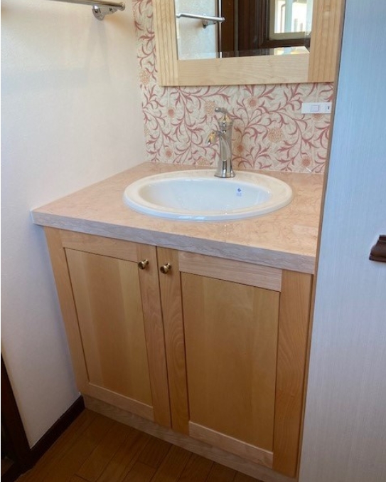 カバ桜材の洗面台をお届けしました。天板には淡いピンクが美しい天然大理石を合わせました。