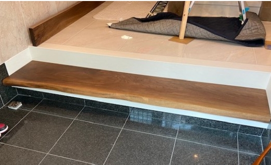 玄関先にこだわりのウォールナット一枚板をサイズピッタリにカットしてお届けさせて頂きました。綺麗な玄関先をウォールナット一枚板の木のぬくもりを取り入れて、素敵なアイデアですね!