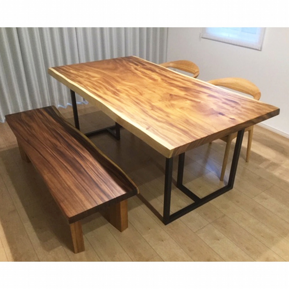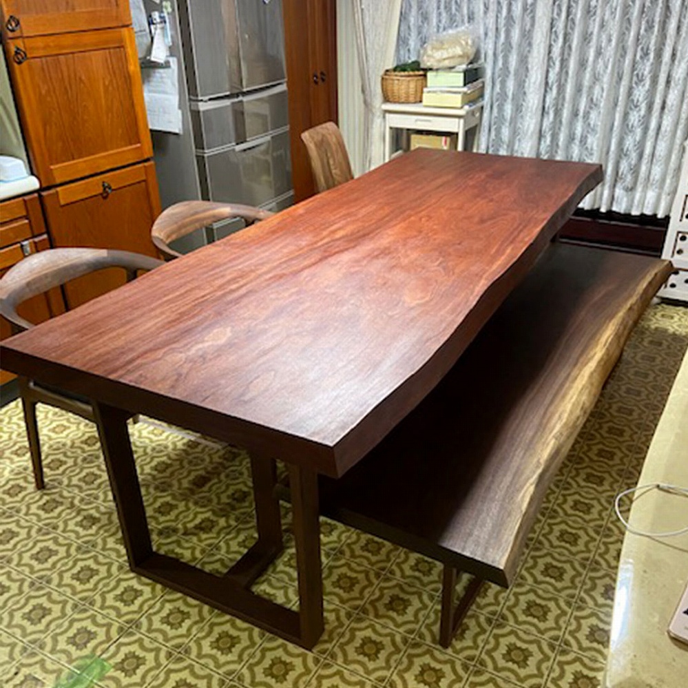 お揃いでモンキーポッド材の一枚板ベンチも一緒にお届けさせていただきました。