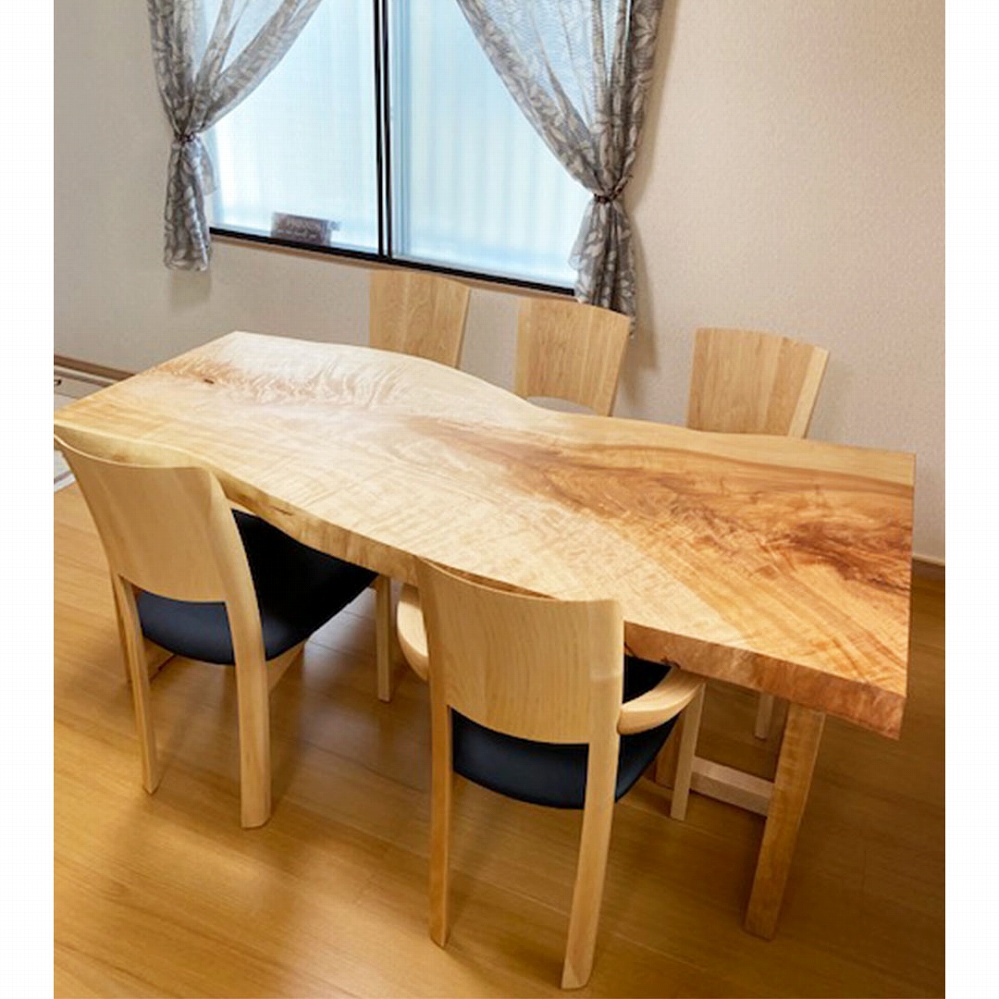 少しくねった形できらきらの杢を出しているとてもユニークな栃(トチ)の一枚板をお届けさせていただきました。