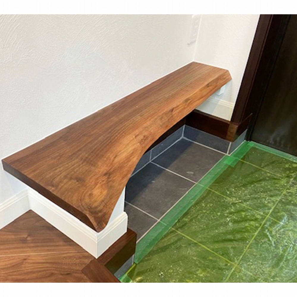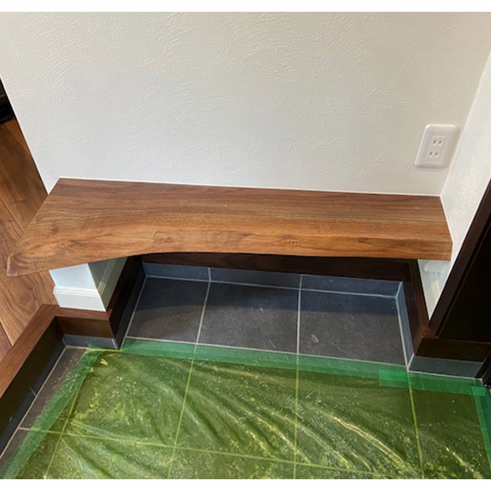 玄関のベンチにはウォールナット材の一枚板をサイズ・形ともにぴったりでお届けさせていただきました。