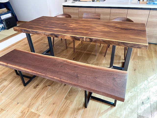 パープルハートの一枚板と共に、ウォールナット材の一枚板ベンチやイスをお届けさせていただきました。