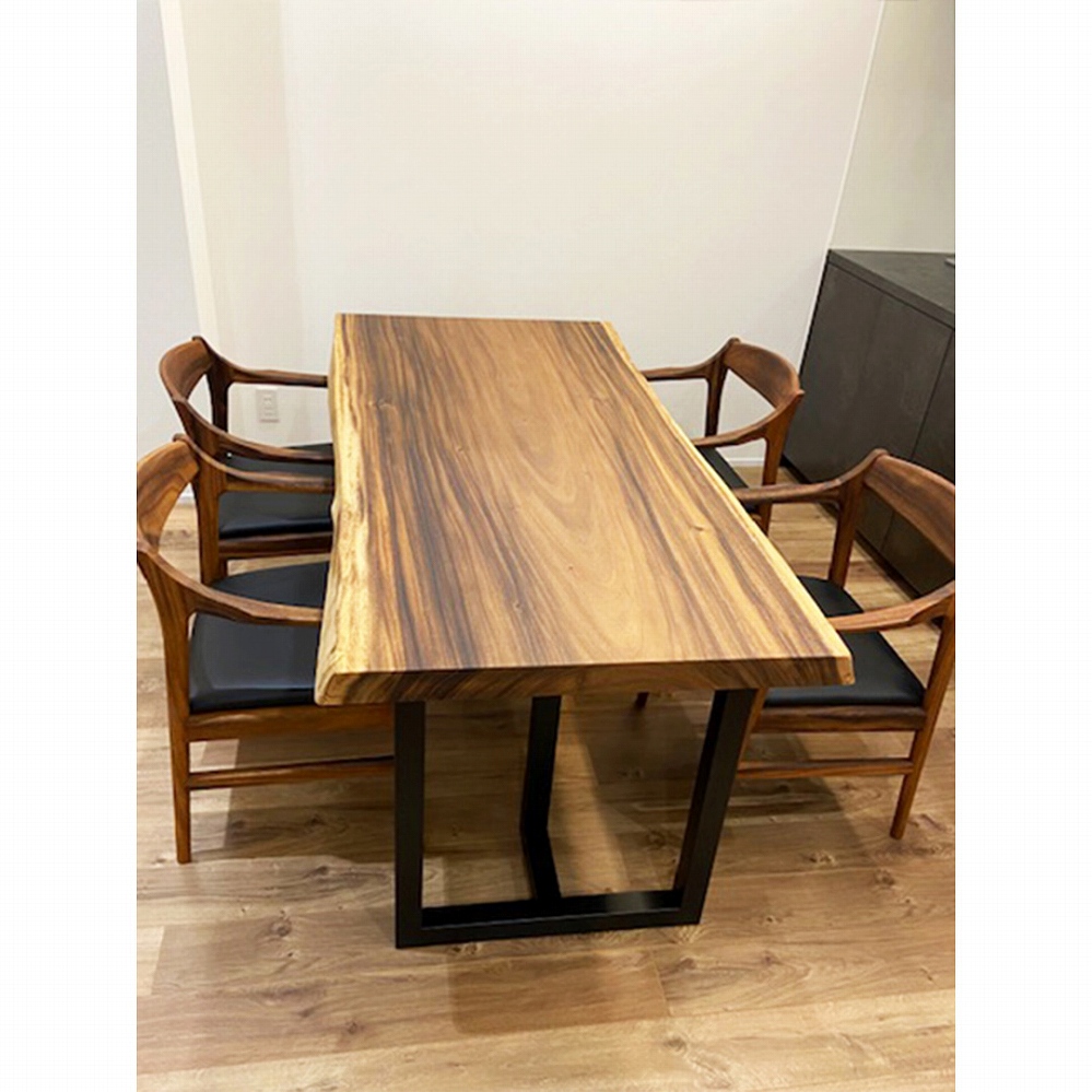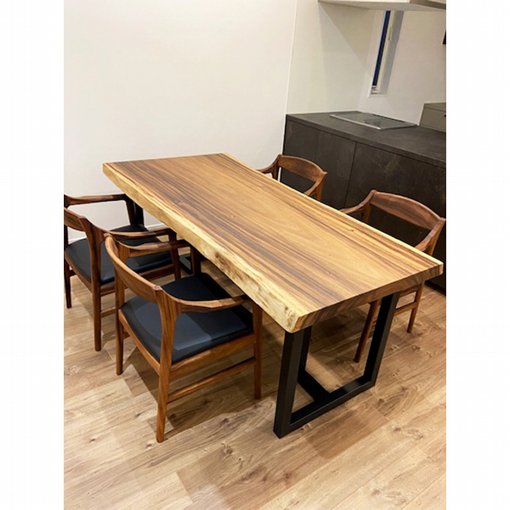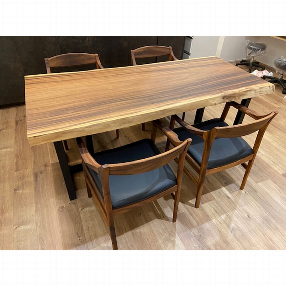モビンギの木の皮の色合いがウォールナットの色合いに良く似ていて、まるでバイカラーのダイニングセットのようです。
