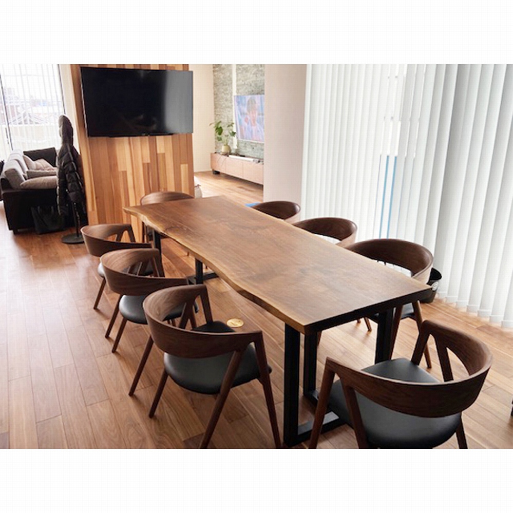 アイアンとチェアの黒い座面が一段とウォールナット材の一枚板を引き締めます。