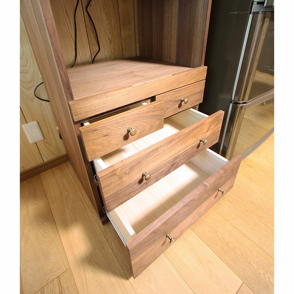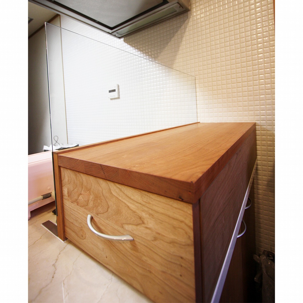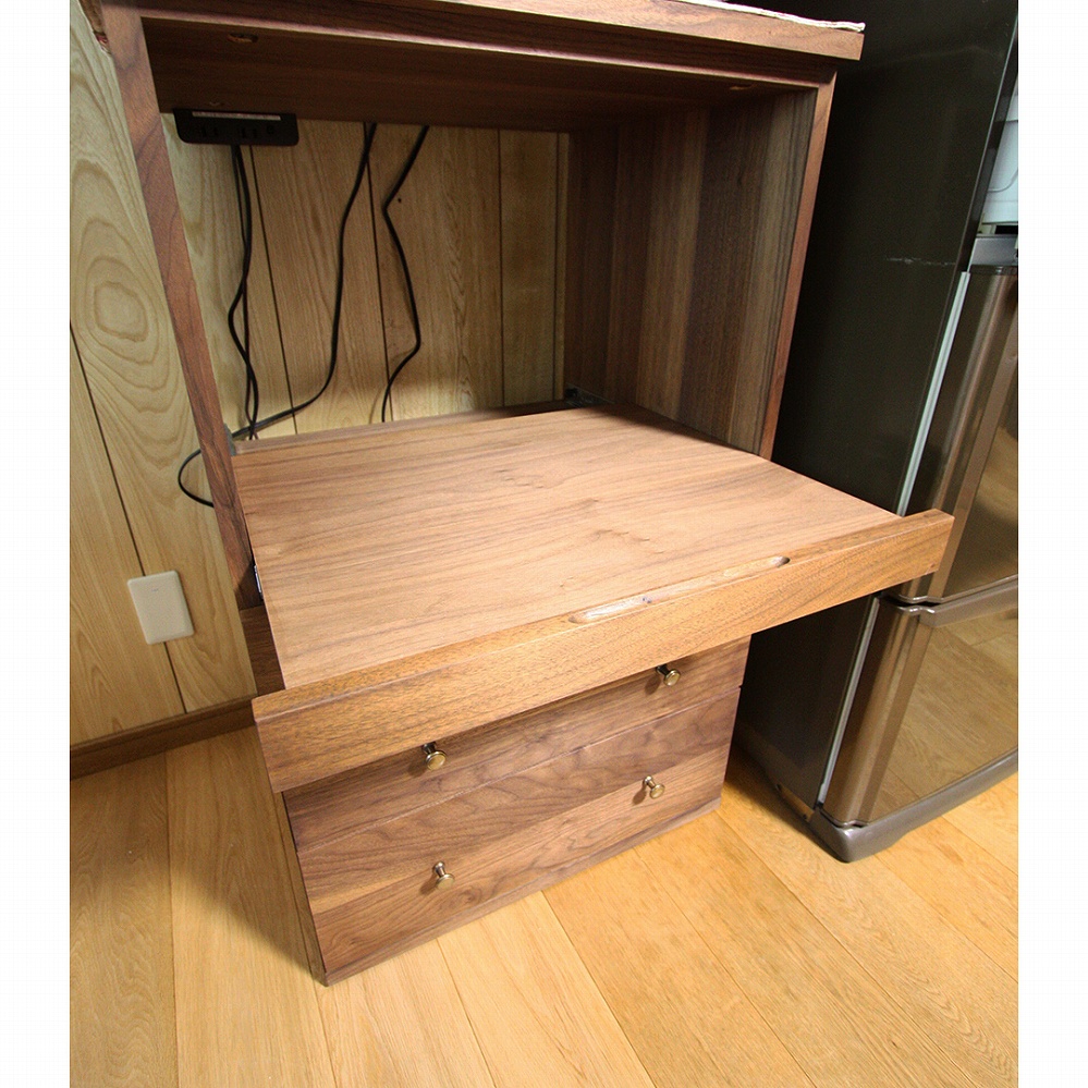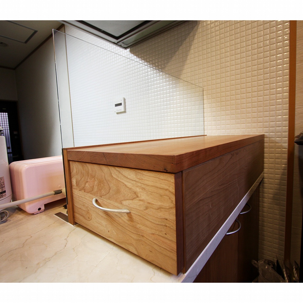 キッチンと同じブラックチェリー材にて引出し収納を付けました。