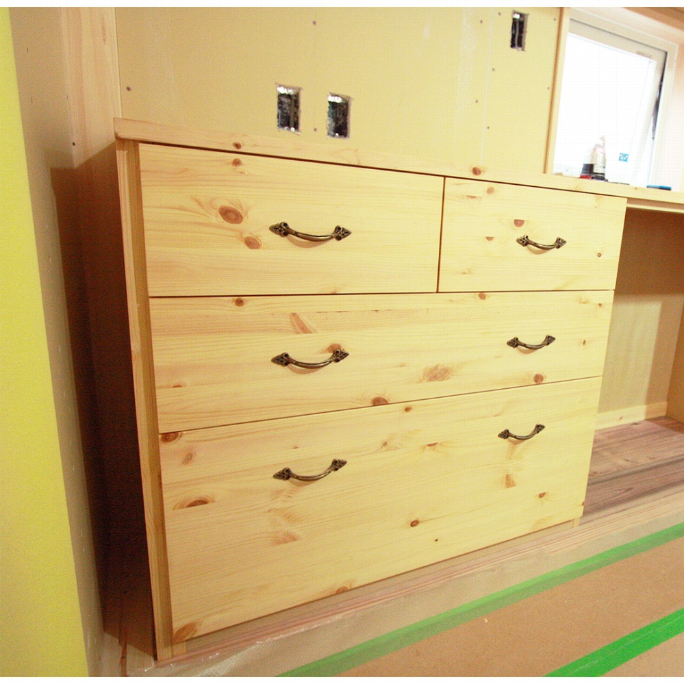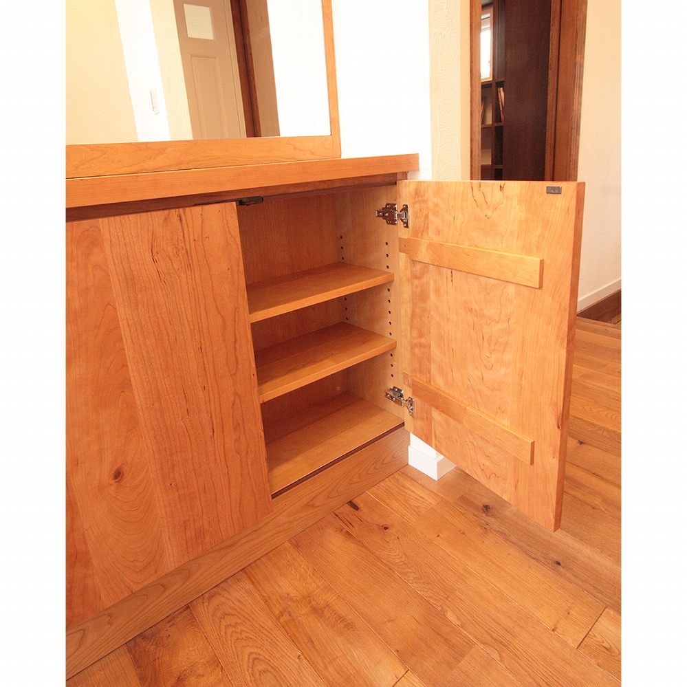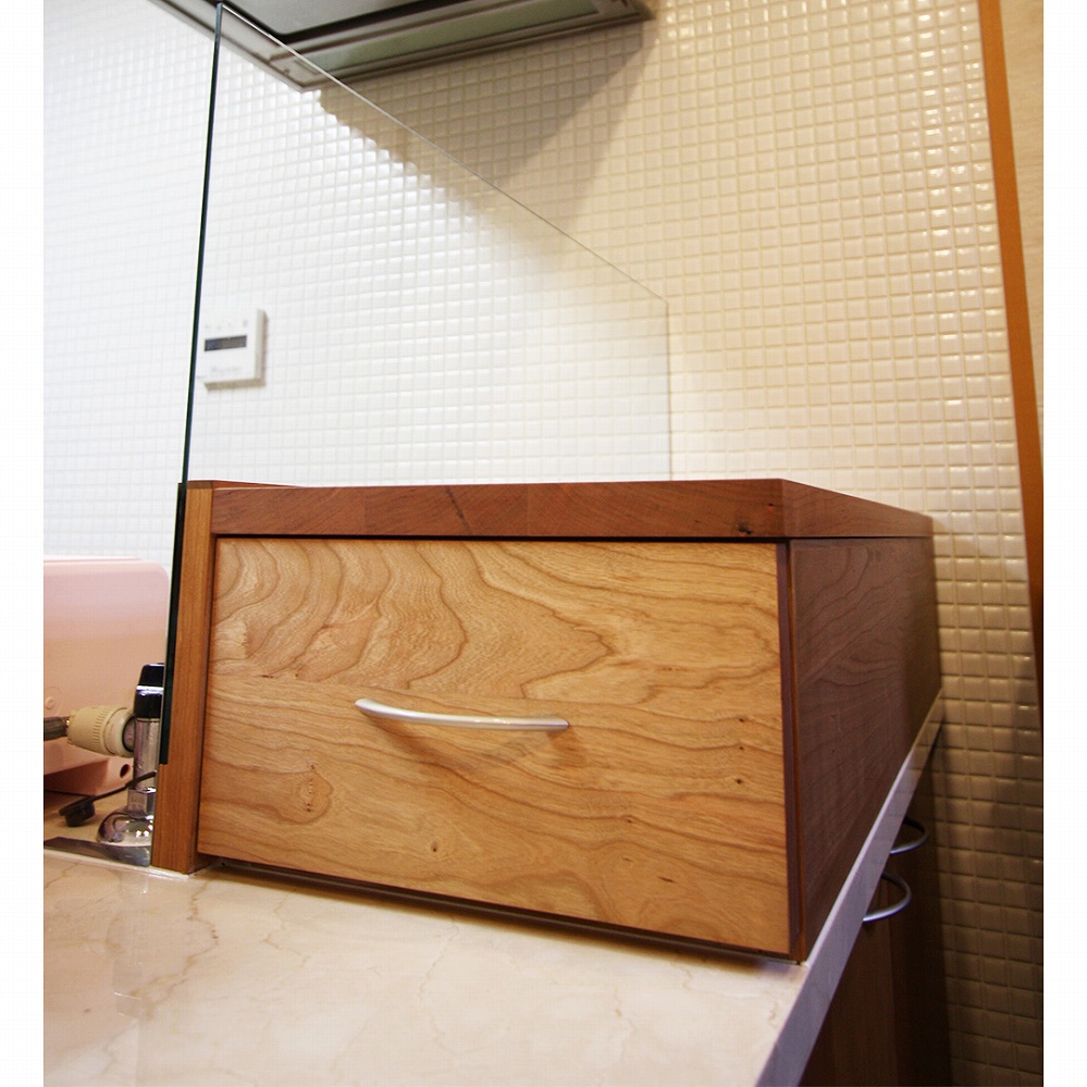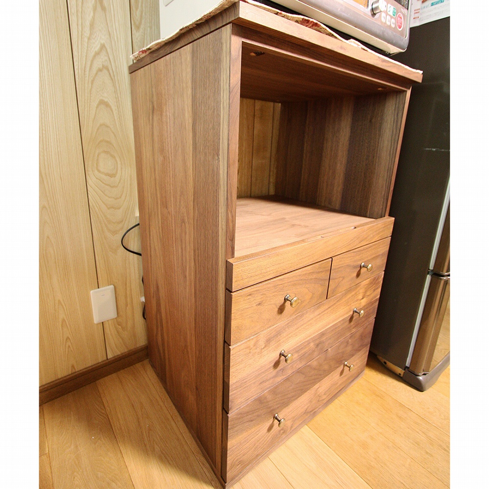 キッチンと同じブラックチェリー材にて引出し収納を付けました。