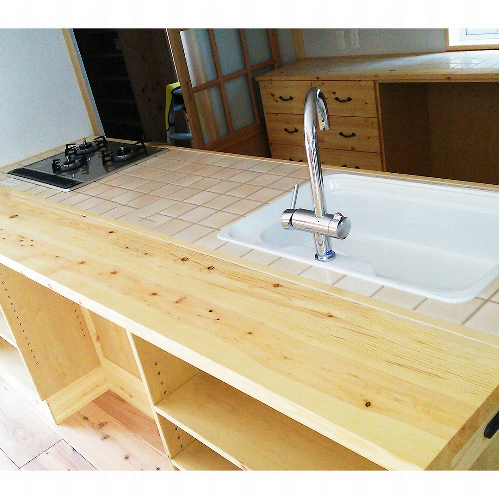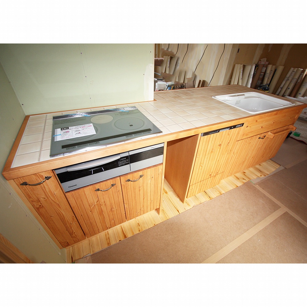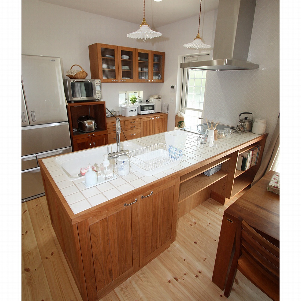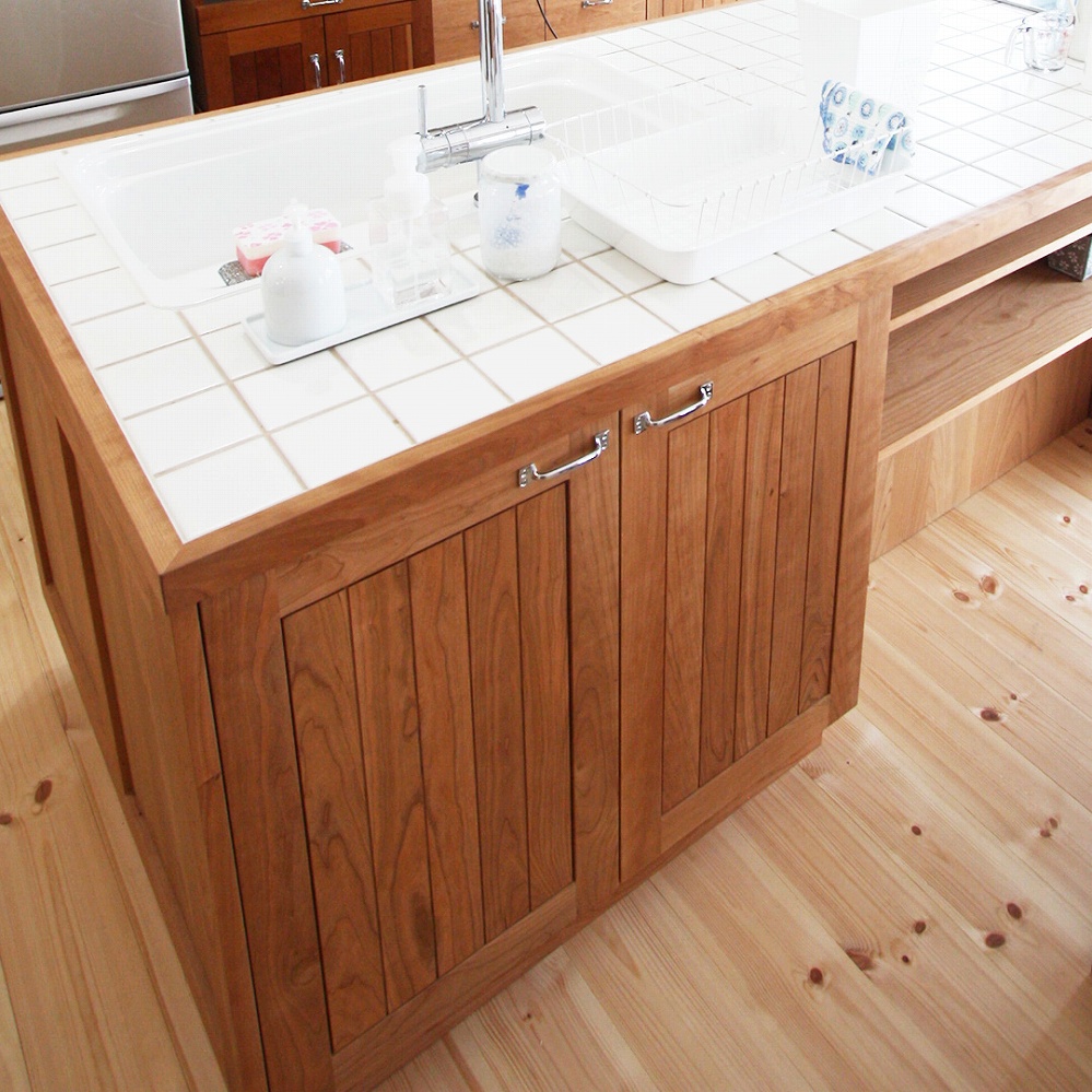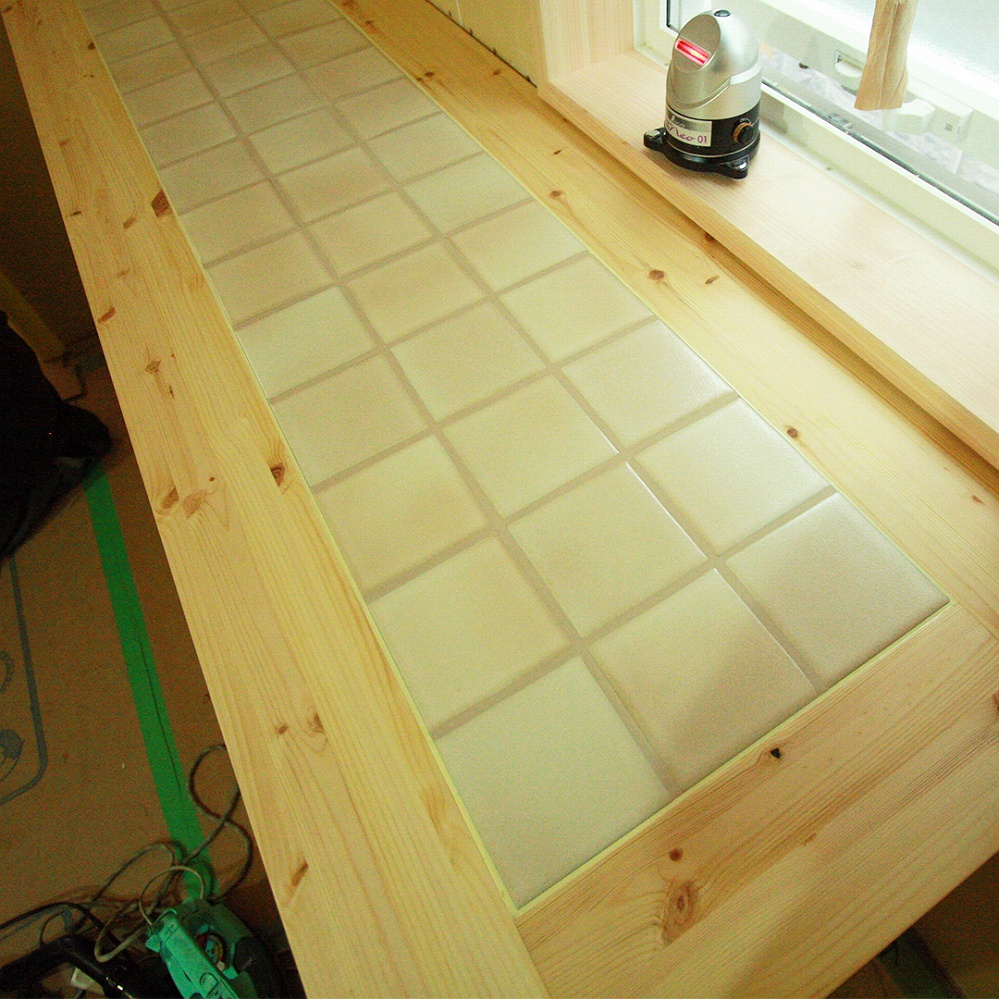 天板の磁器タイルやパイン材の温かみのあるウッディな雰囲気に仕上がっています。
