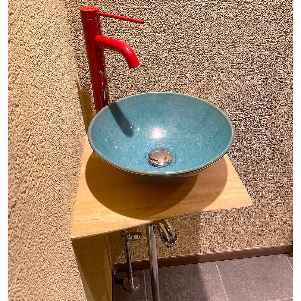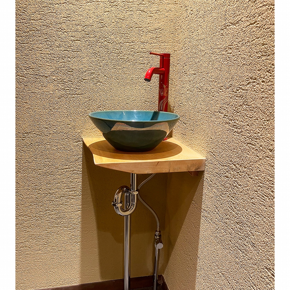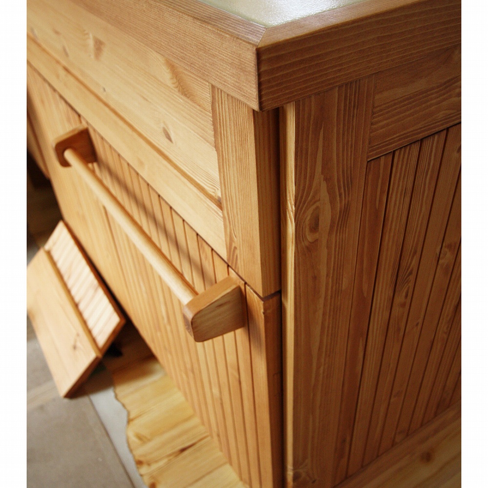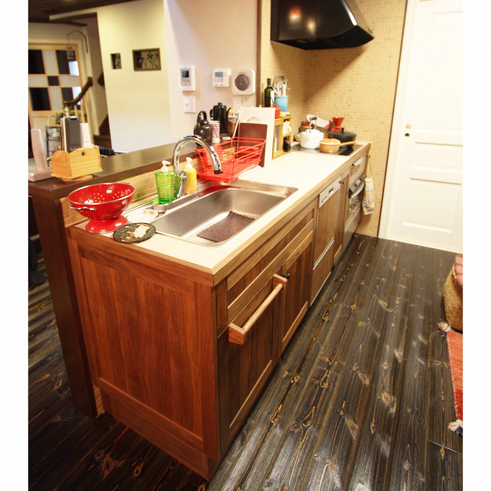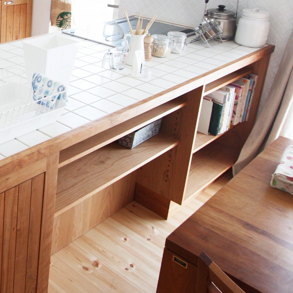 天板の磁器タイルやパイン材の温かみのあるウッディな雰囲気に仕上がっています。