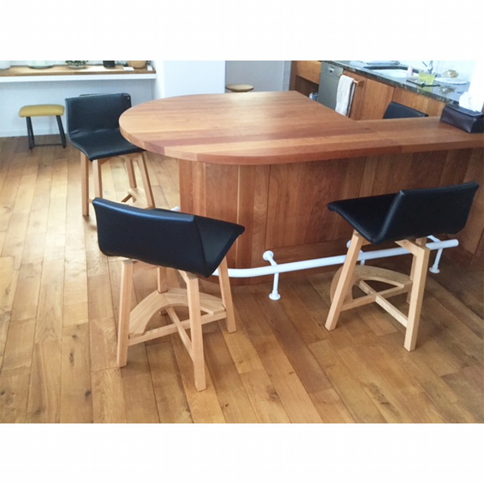 カウンターには足をかけるステップバーを付けました。カウンターに合わせてU字型の白いバーを特注で作成。