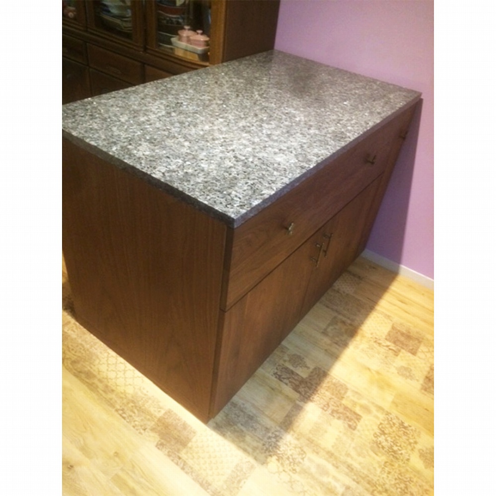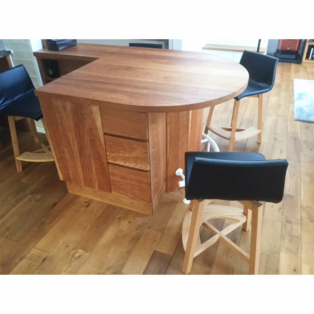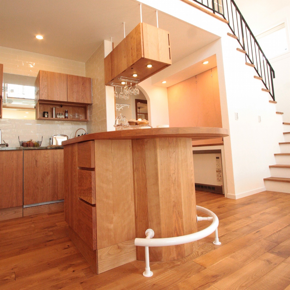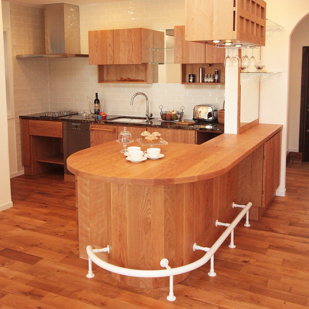 キッチンと同じくブラックチェリー材で作った変形型のカウンター。