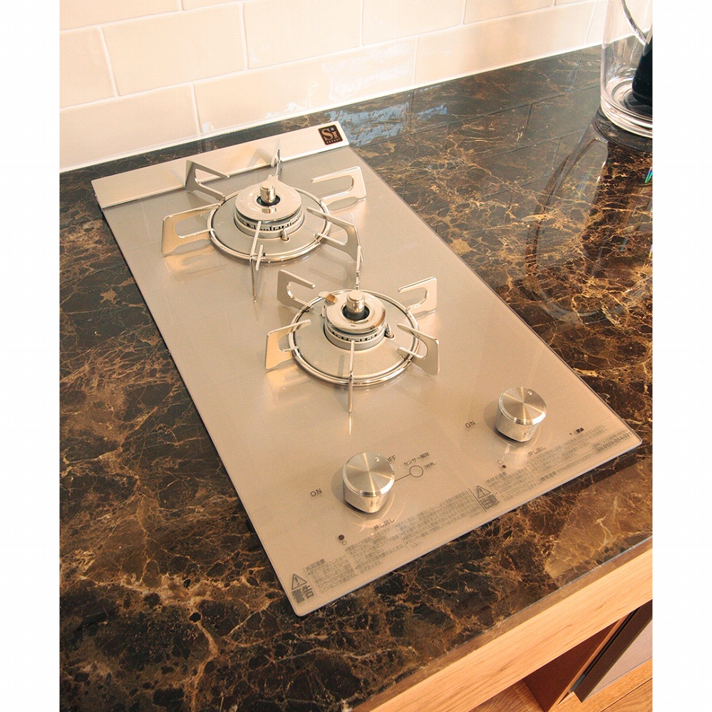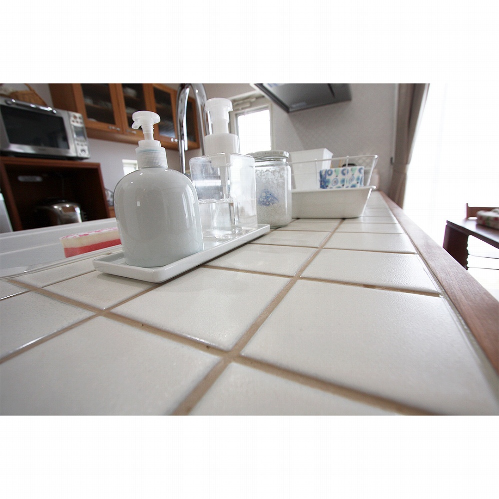 バックキャビネットと共に天板は磁器タイルを貼り、熱いものも直接置ける使い勝手の良い天板です。
