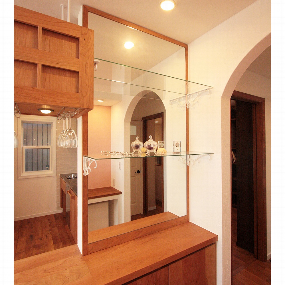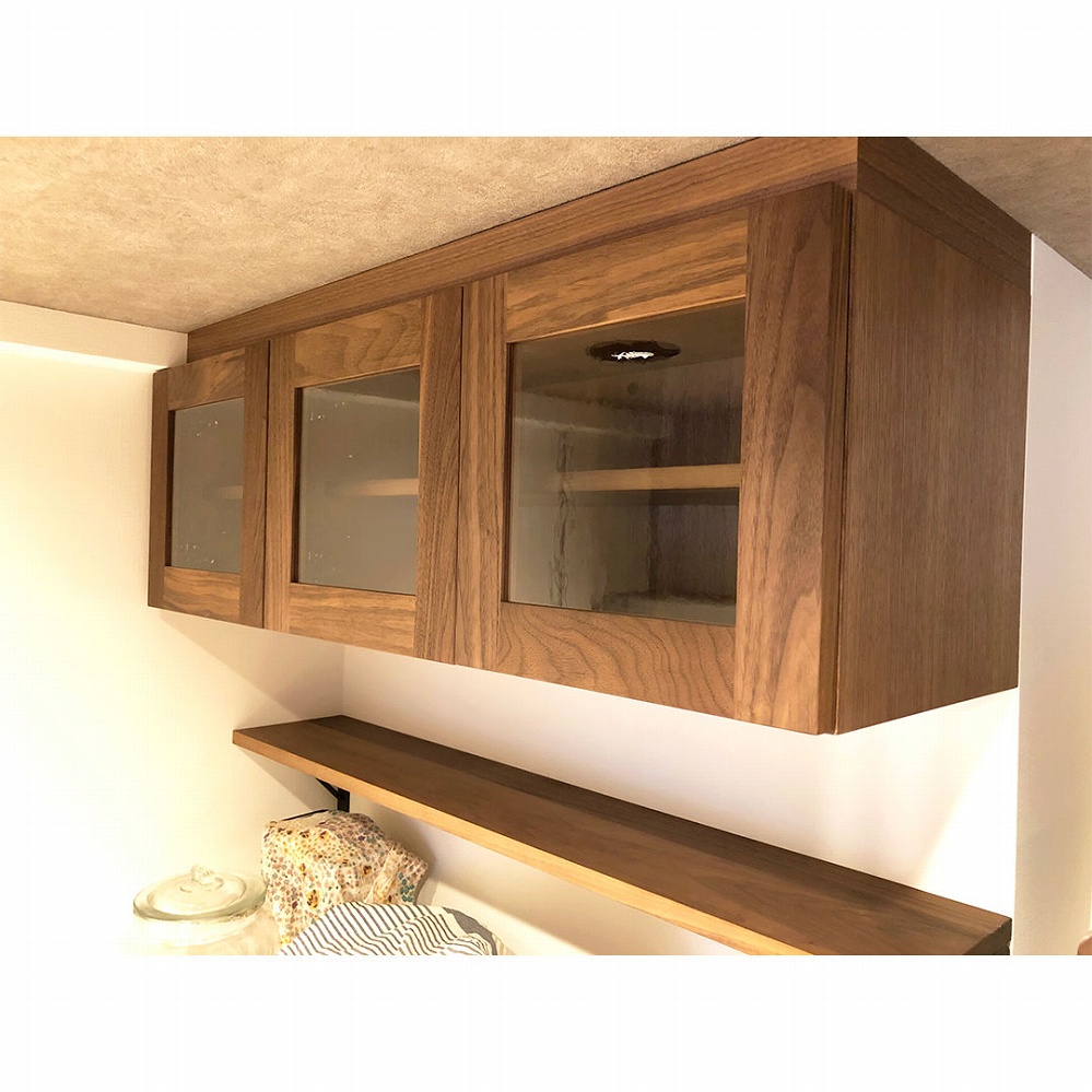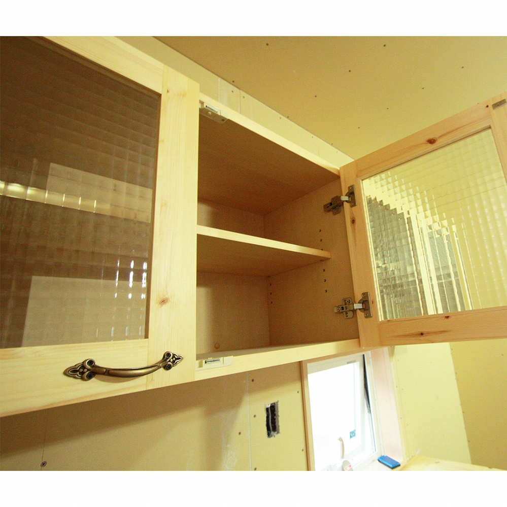 コンロの後ろにもガラス戸の収納棚を合わせて作りました。