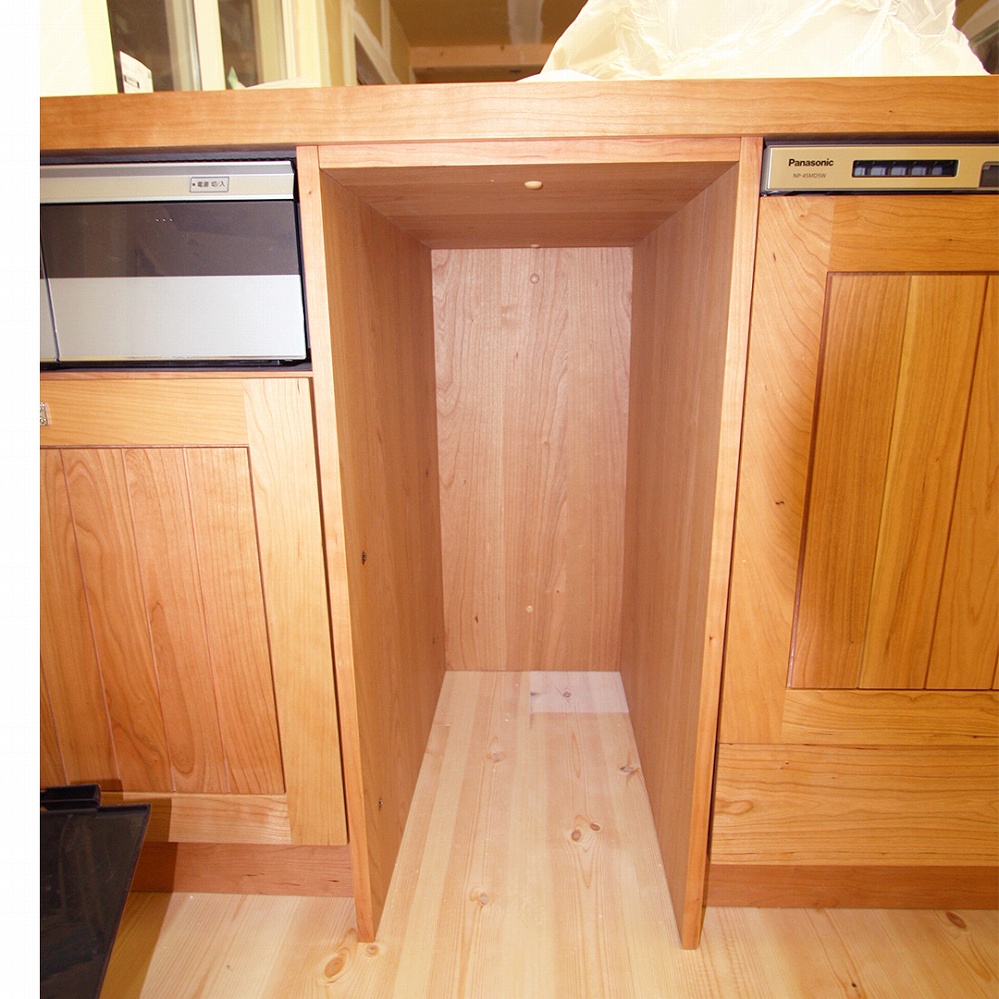 コンロと食洗機の間のオープンスペースはゴミ箱を置く空間を設けています。