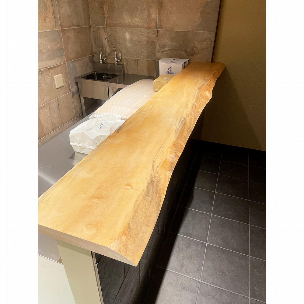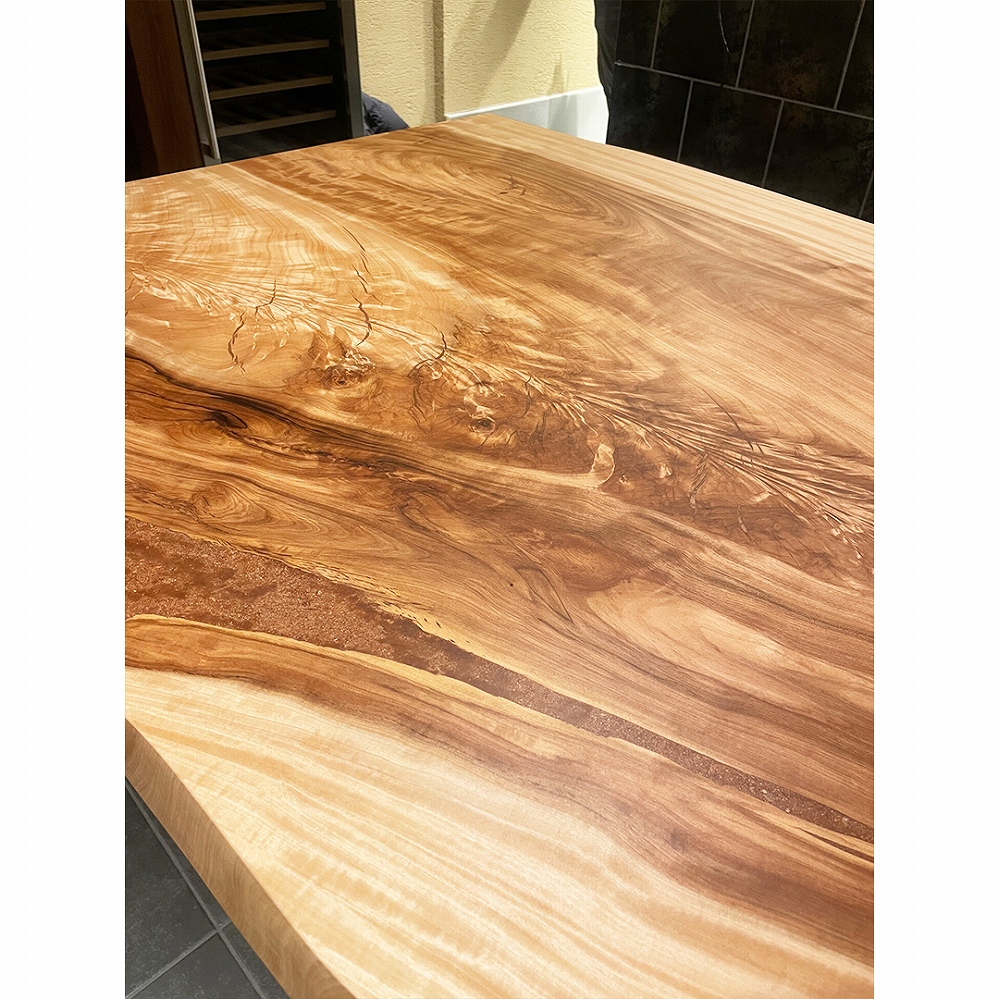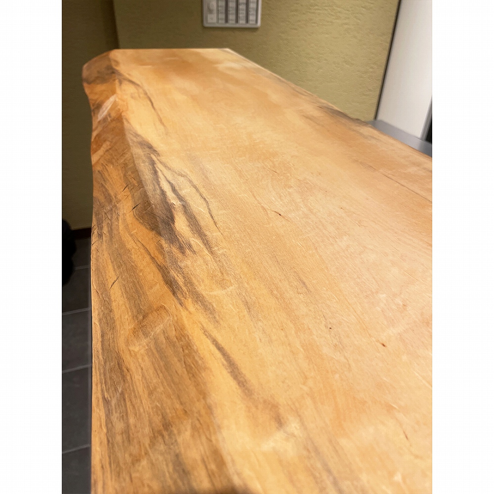 キッチン側には厚みがあり、すらっと長い「最高級の杢入り」タモの一枚板が構えます。