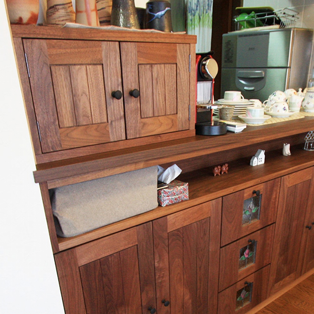 天板にもブラックウォールナット材の無垢を使用し、隠したい物を入れる扉付きの収納棚。