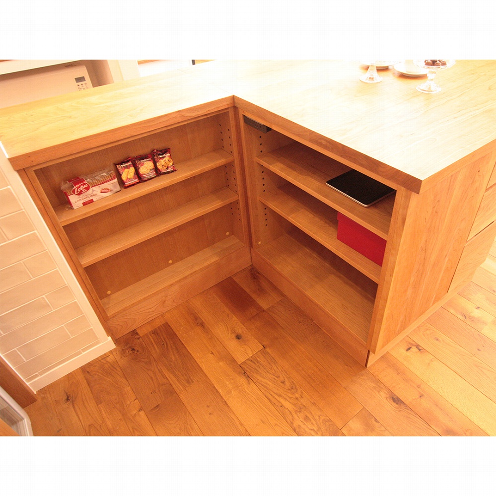 他には無いオリジナルカウンターです。キッチン側には引出し、オープン棚と収納も沢山!