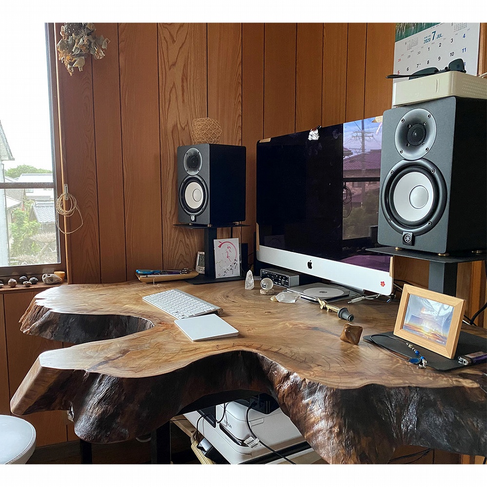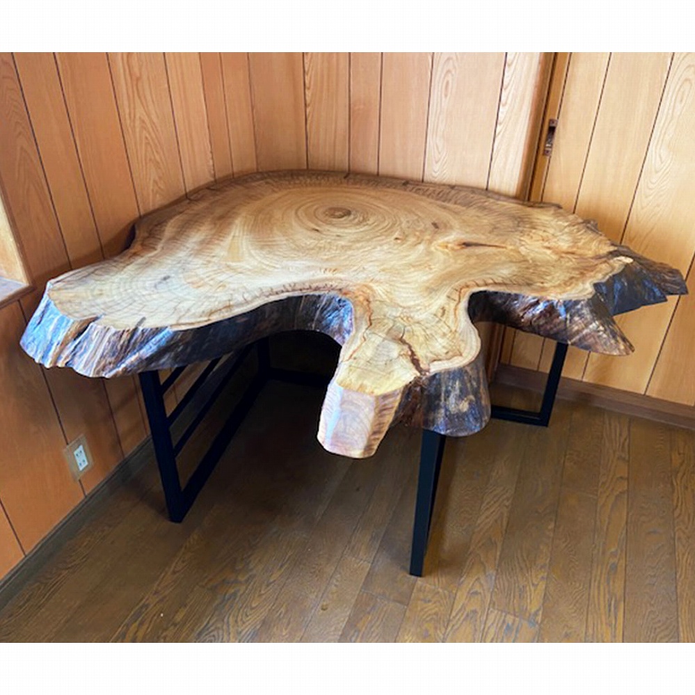 そして「格好良い」が良く合う楠(クス)の輪切りの一枚板デスクは、スリムなアイアン脚を添えて。