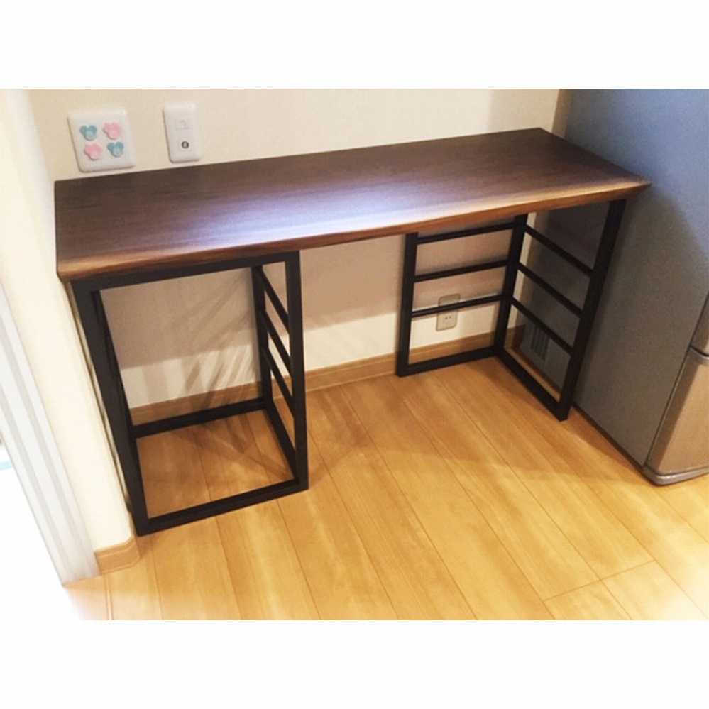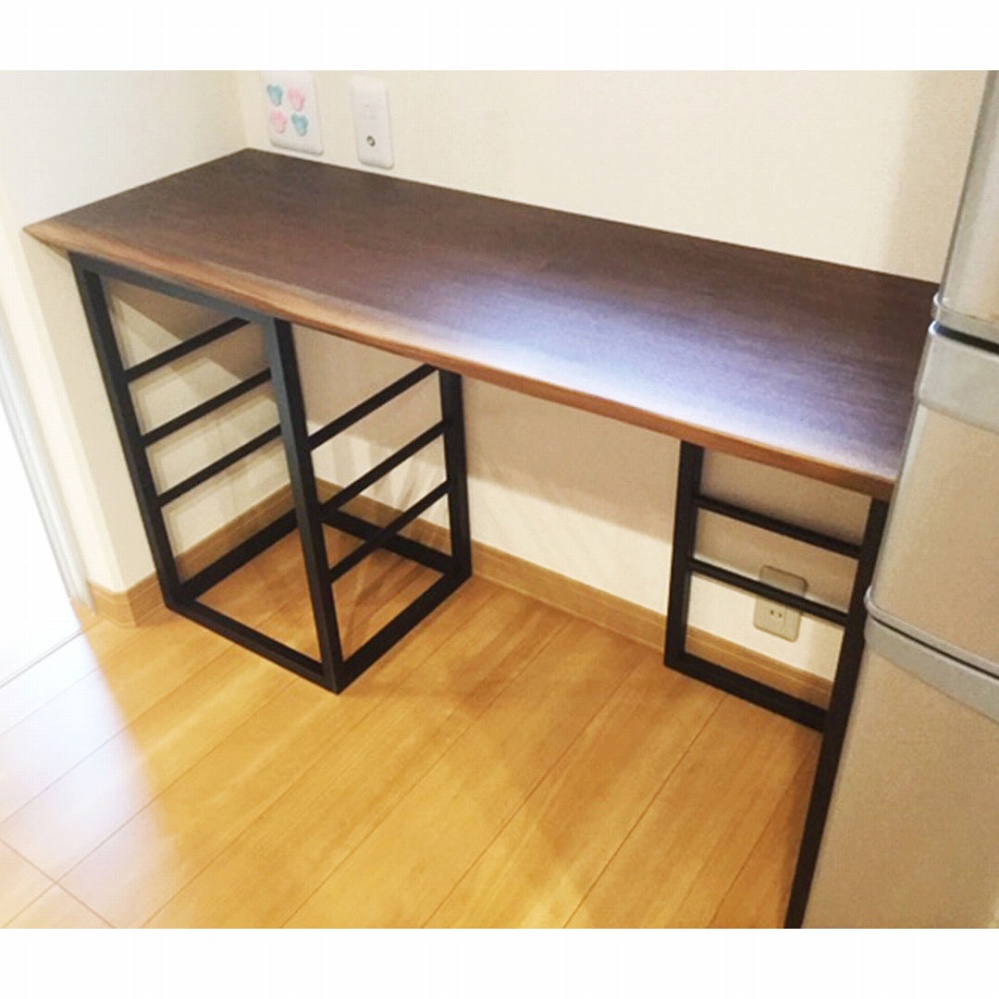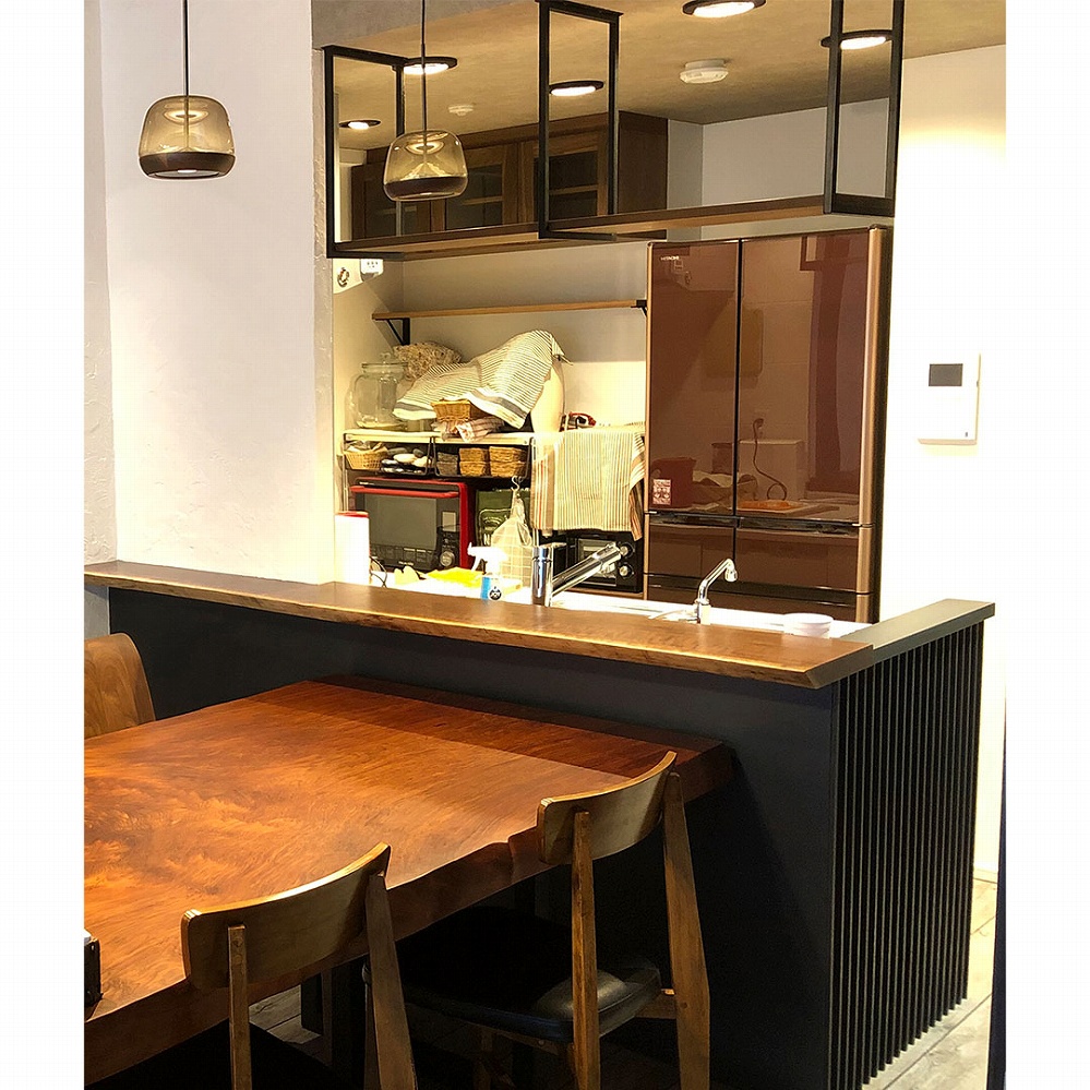 シンプルなキッチンカウンターを、お部屋の雰囲気に合わせた、インダストリアルな格好良い雰囲気にプチリフォーム。ダイニング側になるカウンターの天板には、ウォールナットの一枚板を使いました。あえて木裏で設置することで、スタイリッシュな印象になります。