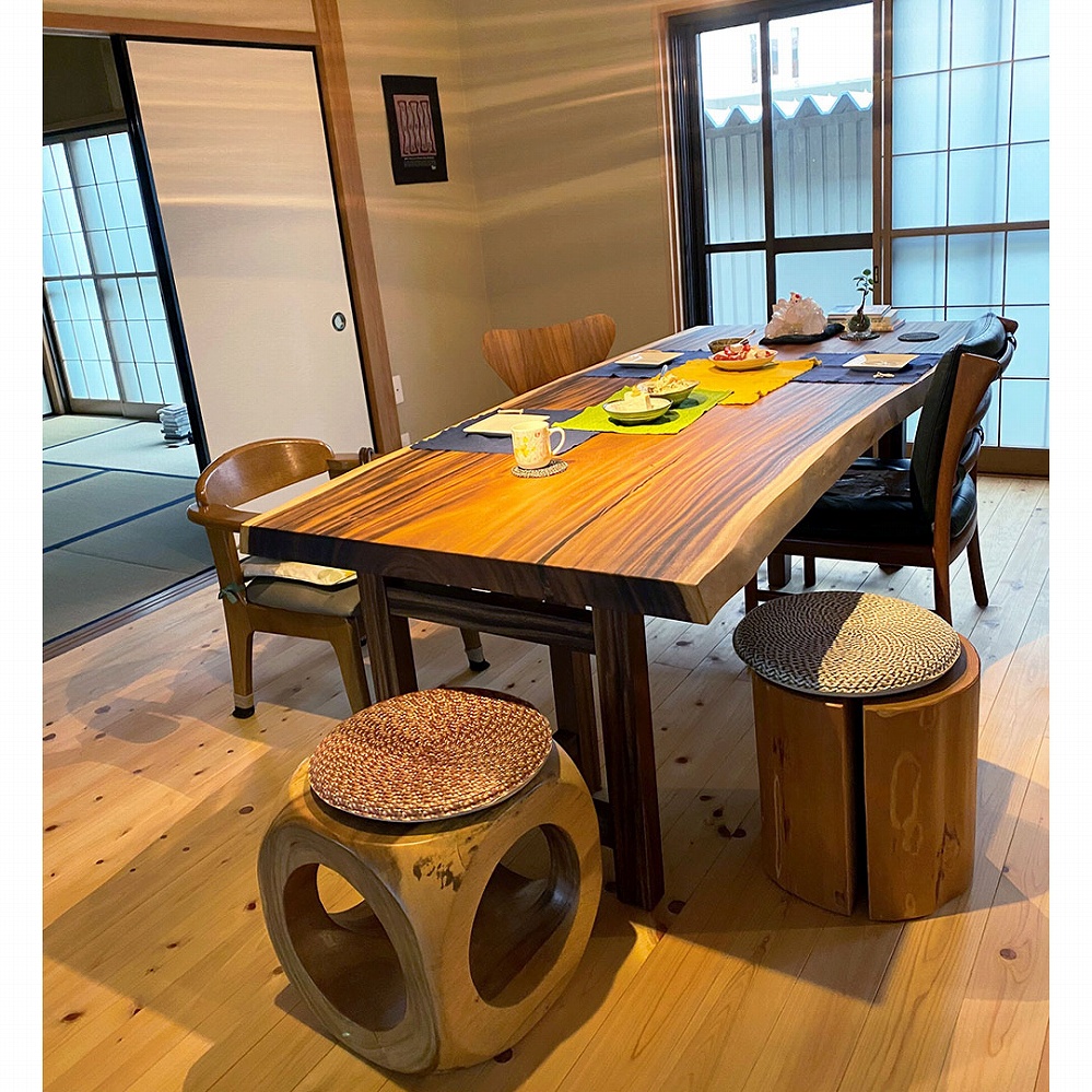 明るいダイニングには木目がすーっと伸びたモンキーポッドの一枚板と、同じモンキーポッド材の脚を。
