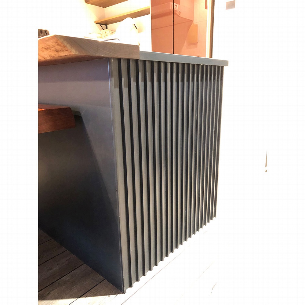 そしてキッチンの側面や背面はあえて無骨なアイアンの黒を巻いて異素材の格好良さを出しています。