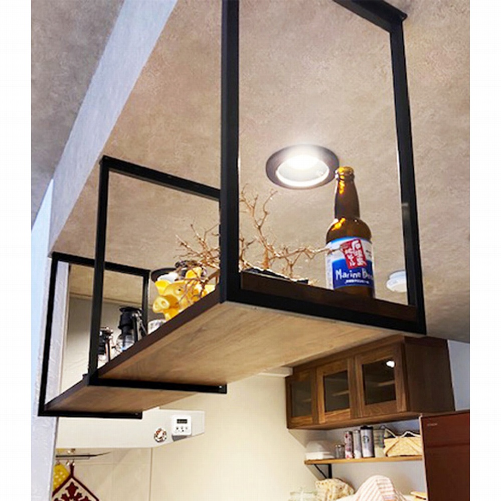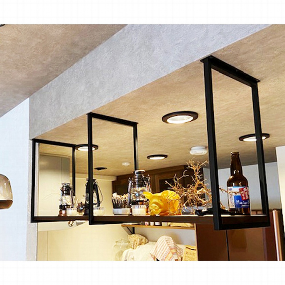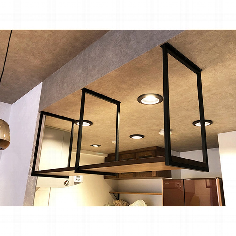 キッチンカウンター上に天井からアイアンを下ろし、インダストリアルな空間の完成です。