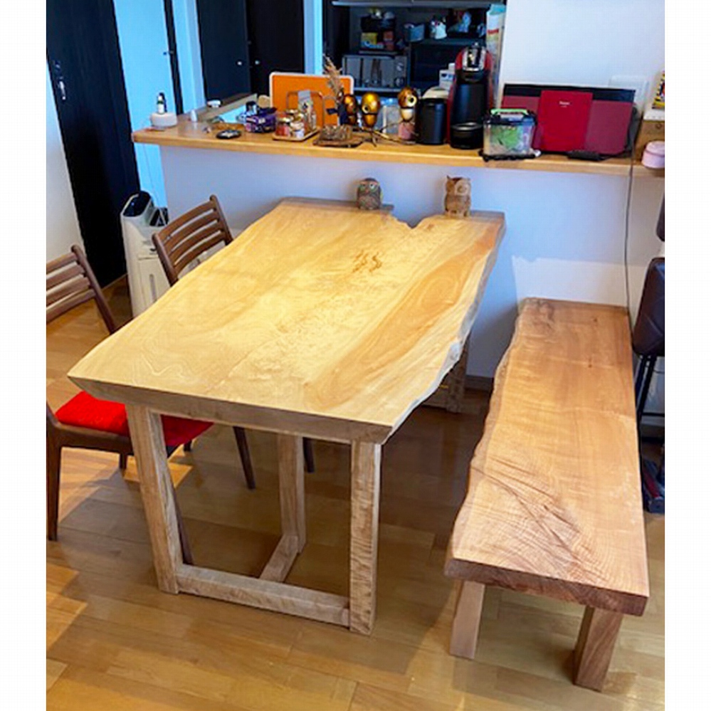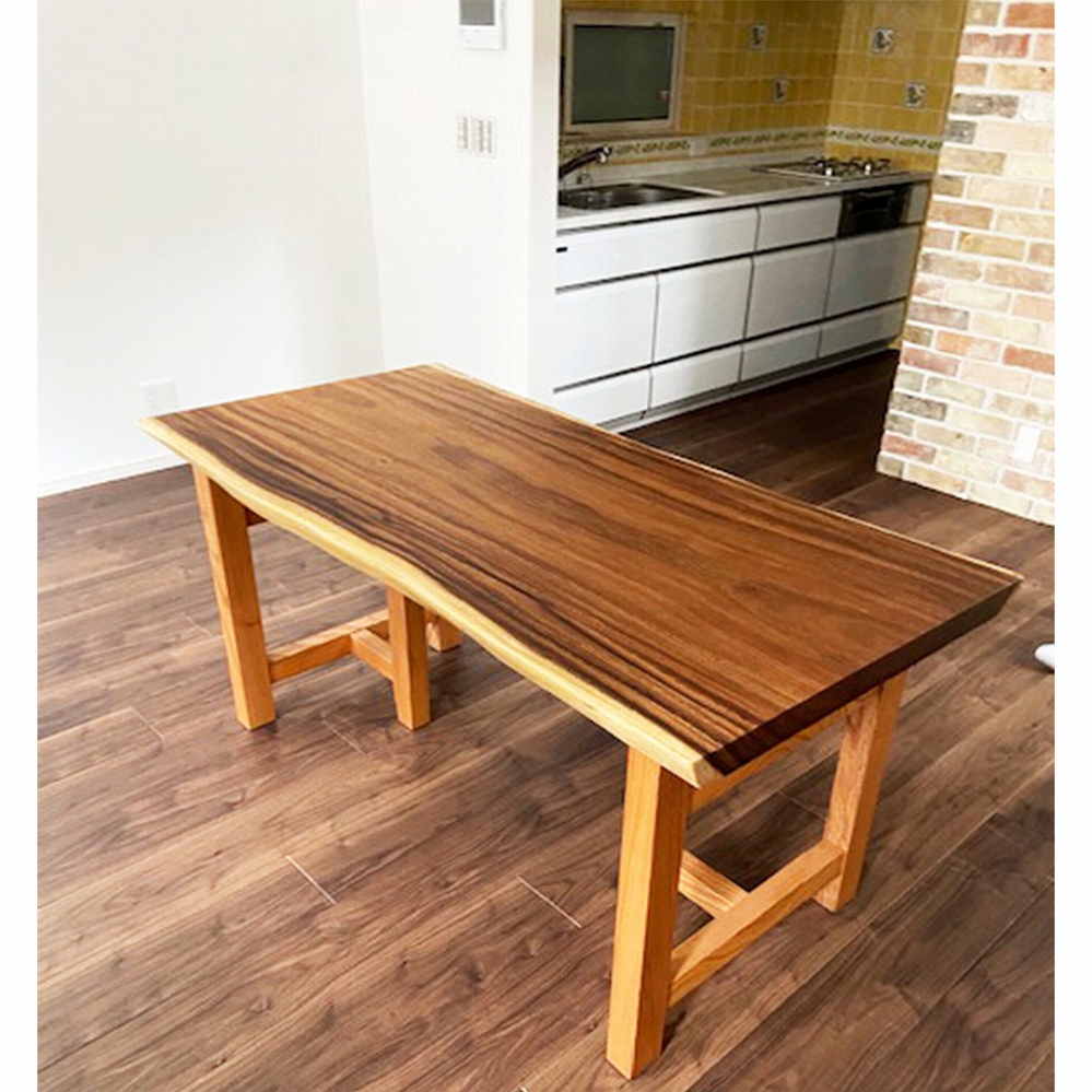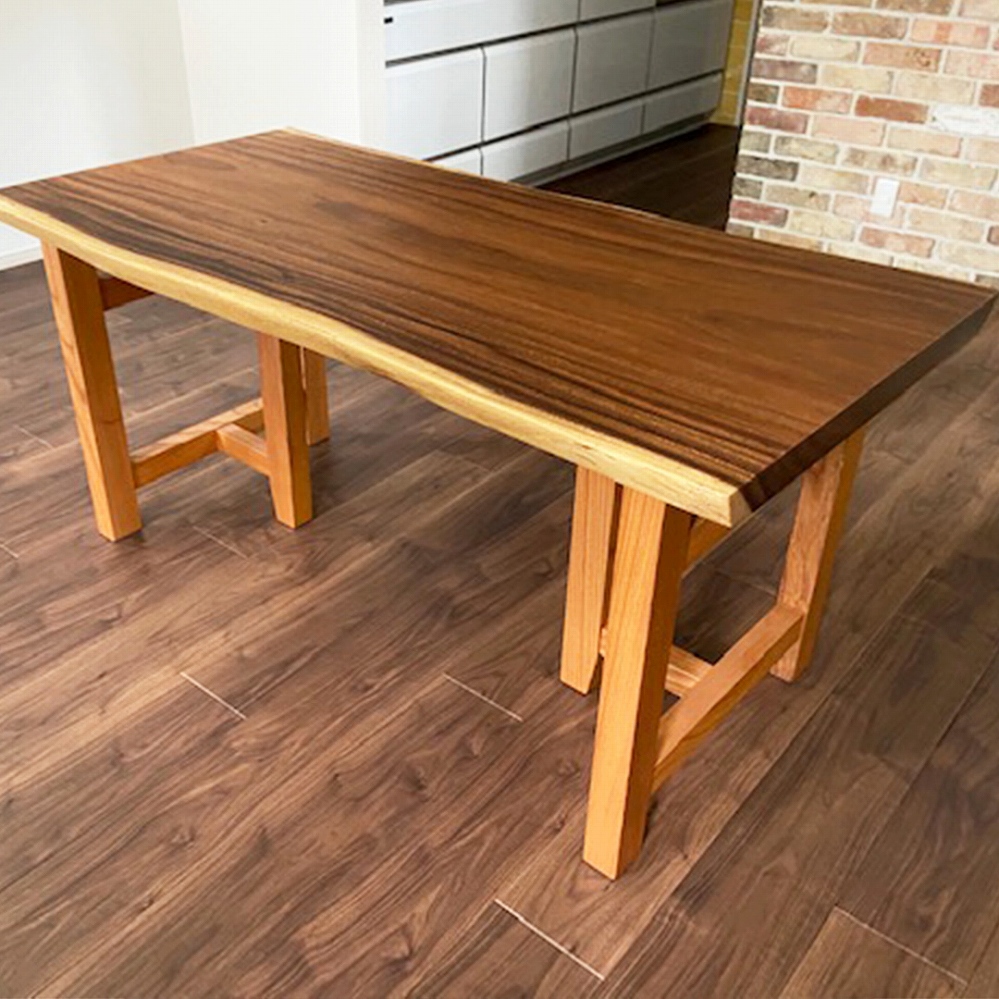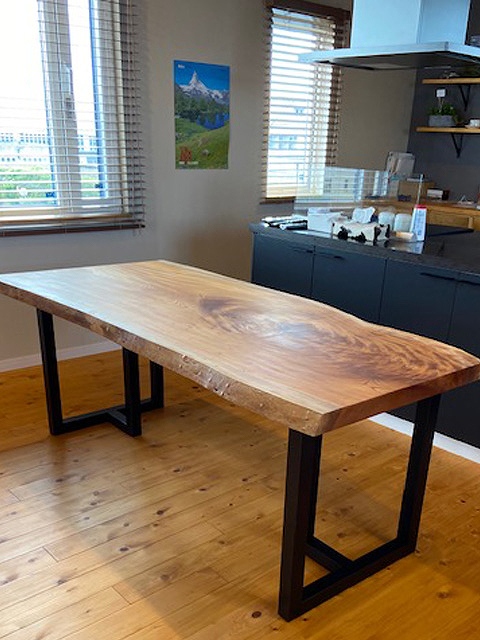 柔らかな木目のモンキーポッドと欅の脚をお届けさせていただきました。