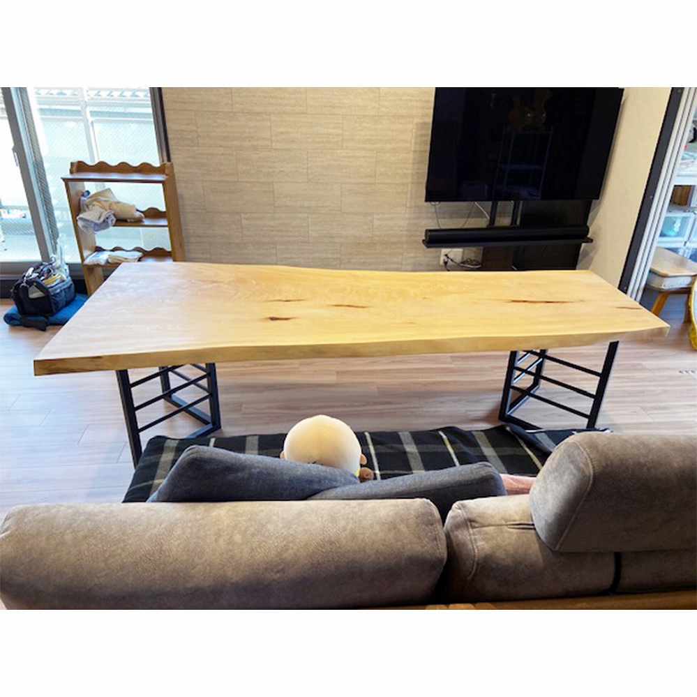 明るいお部屋に栃(トチ)の一枚板をお届けさせていただきました。 お部屋の間取りやソファとも調度良いサイズ感です。