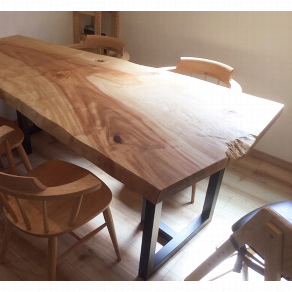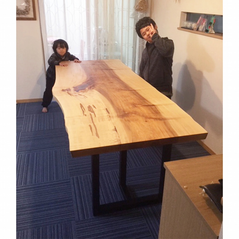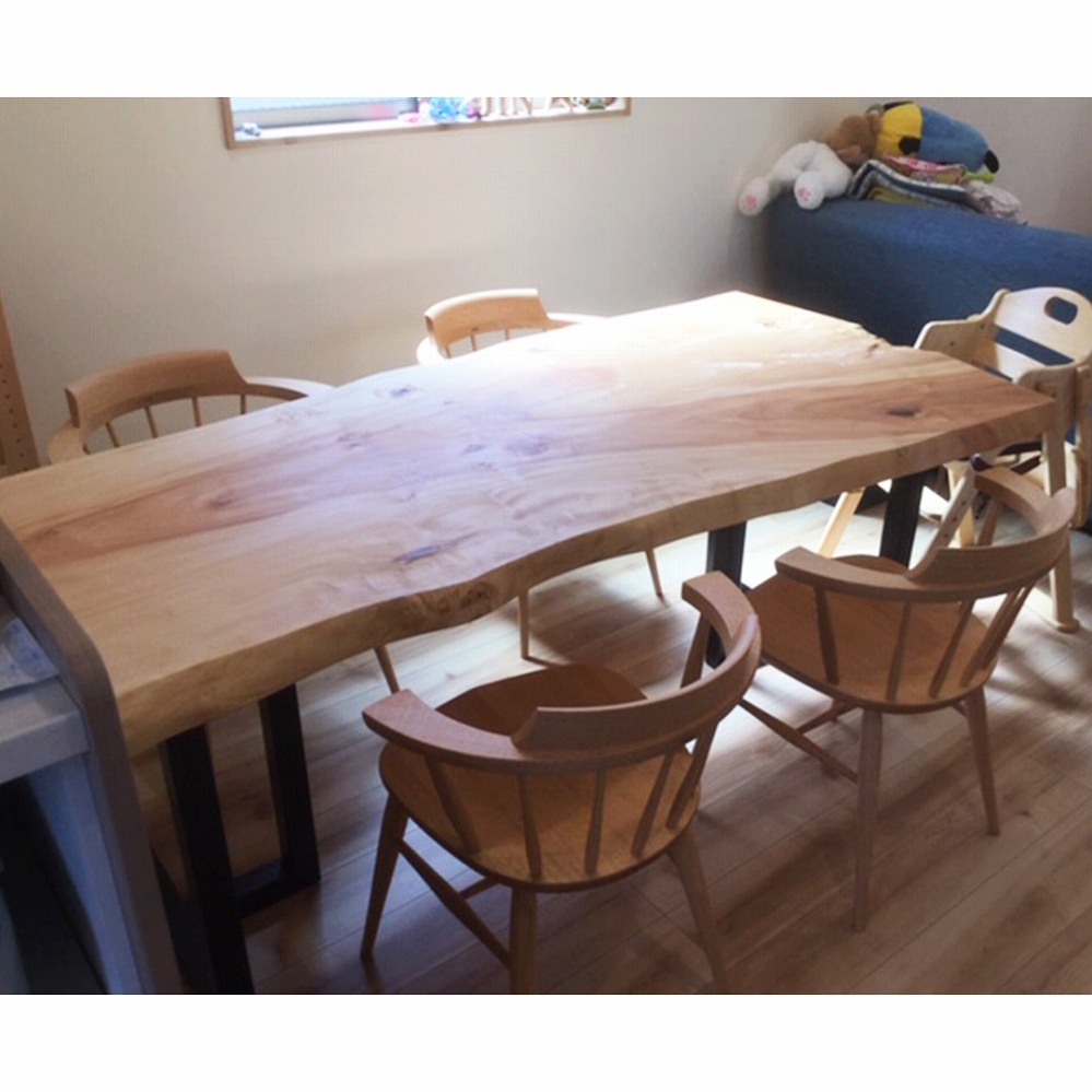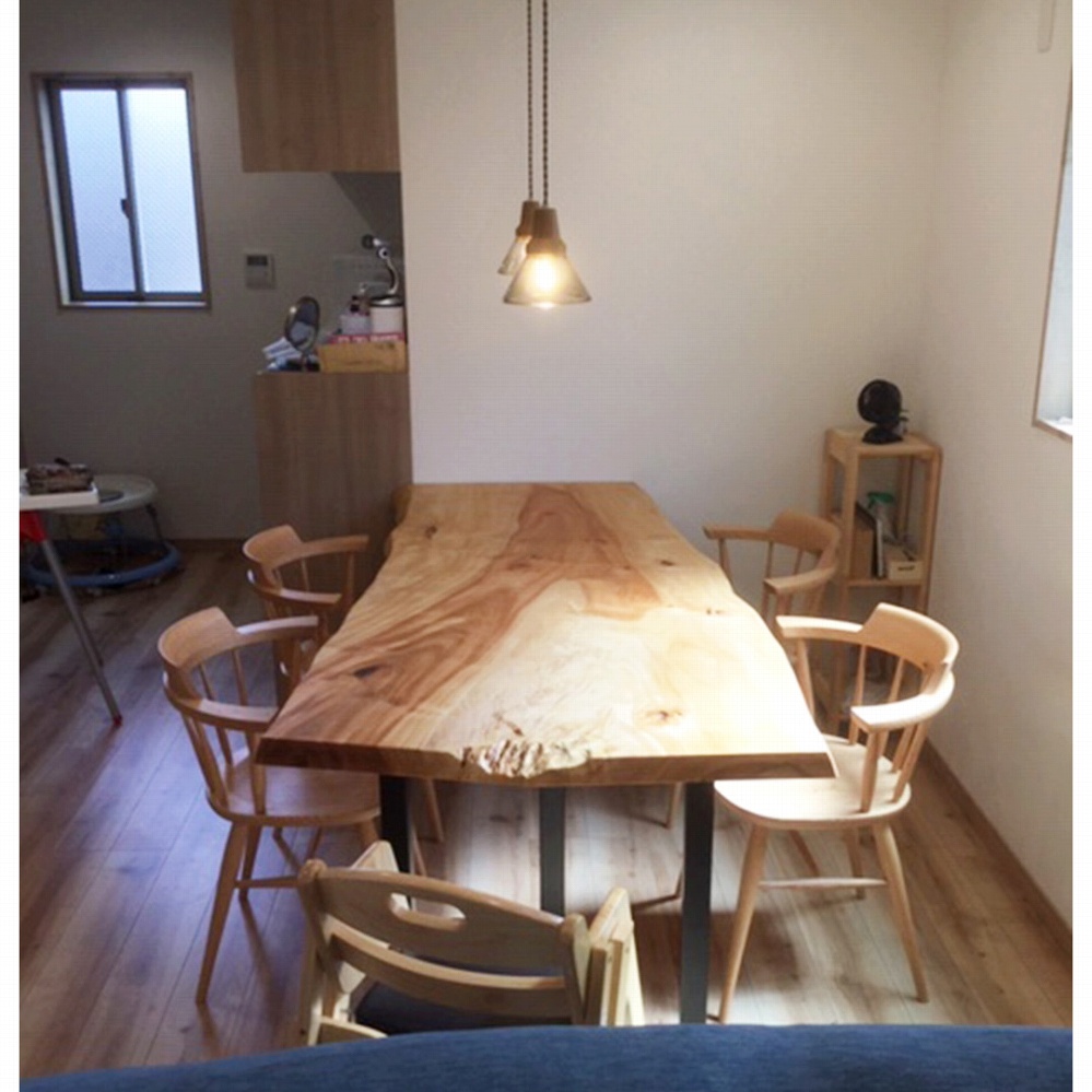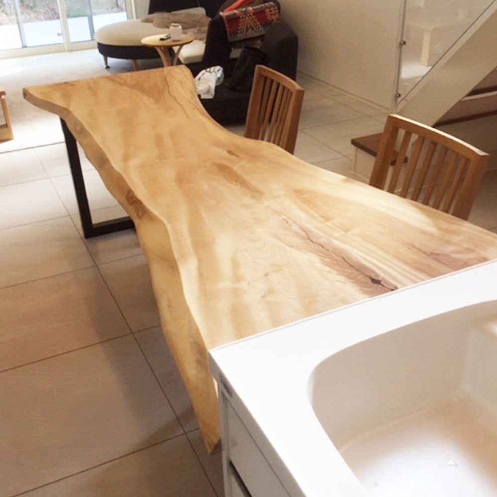 一枚板ならではの変形が素敵な一枚板です。お部屋の雰囲気にも色白の栃材がピッタリ馴染んでいます。